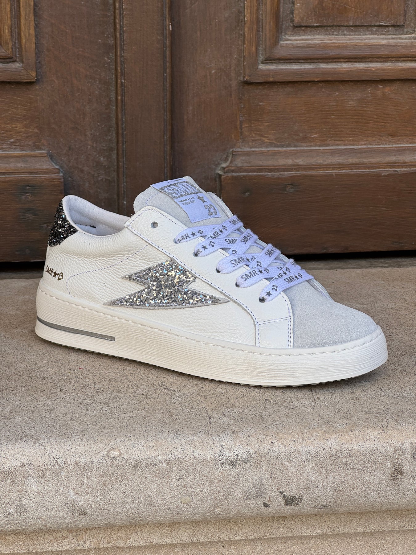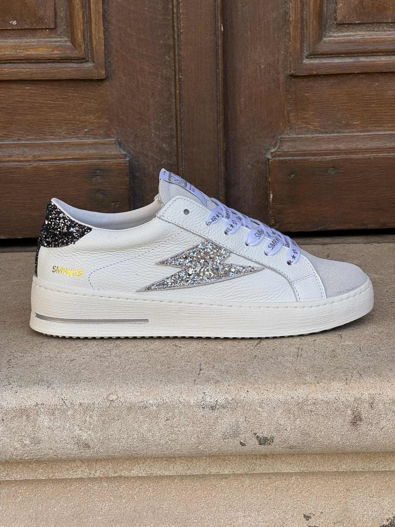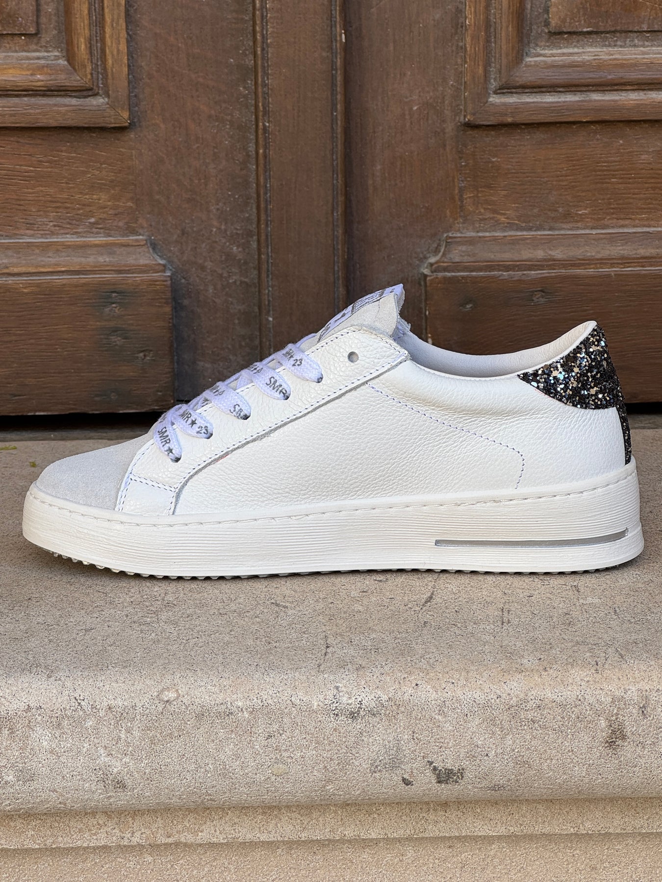 Basket Semerdjian Maya C782 en cuir blanc avec avant en nubuck, éclair pailleté argent sur le côté et talon pailleté noir, semelle en caoutchouc pour un look urbain et féminin