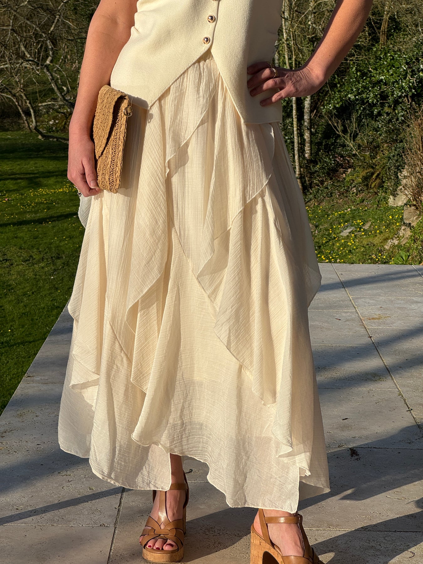 Jupe beige longueur midi en matière vaporeuse avec superposition de volants apportant du volume, idéale pour un look printanier ou estival élégant