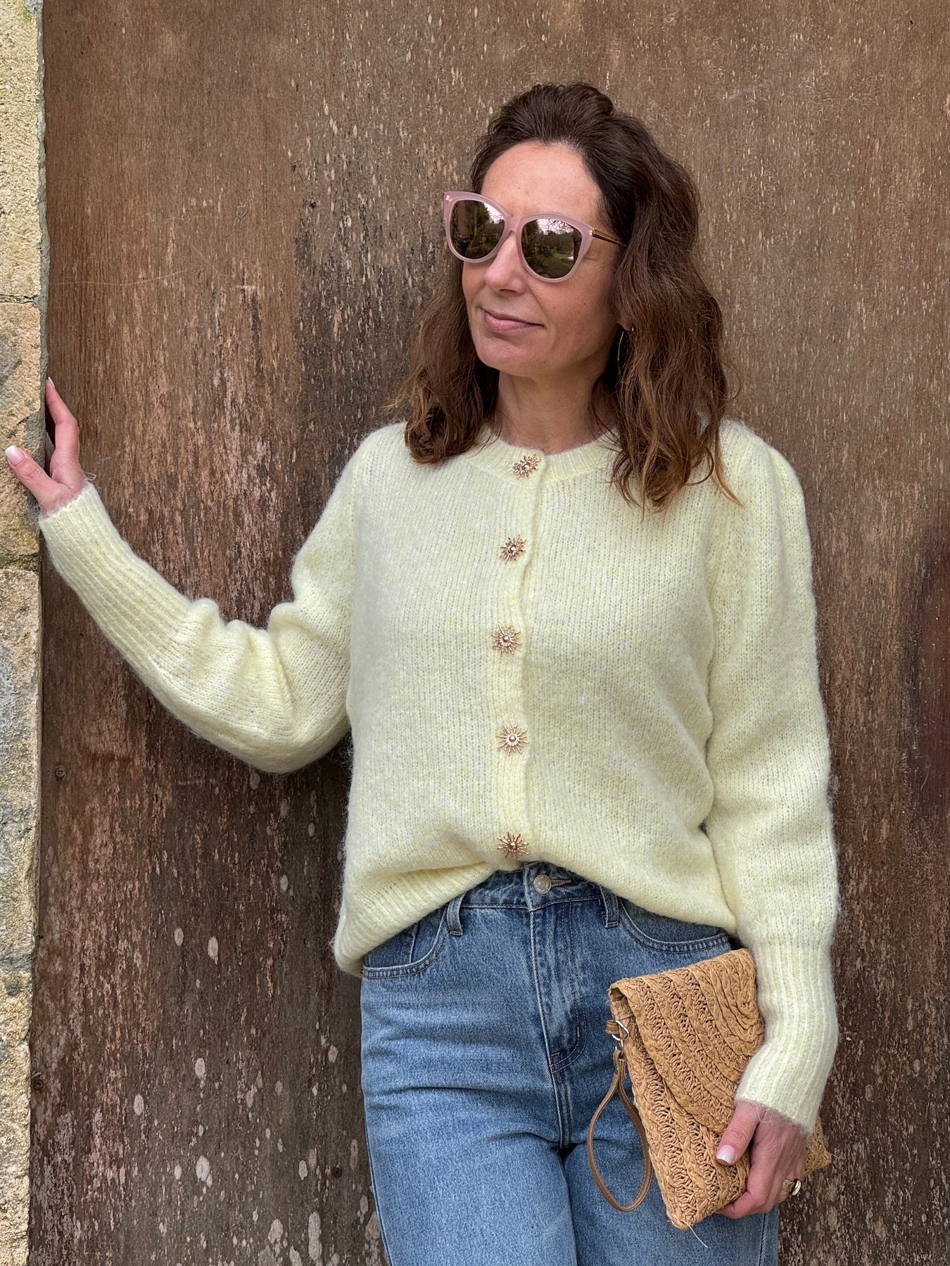 Gilet jaune femme en maille douce avec six boutons dorés soleil et manches resserrées, gilet lumineux et tendance pour la mi-saison