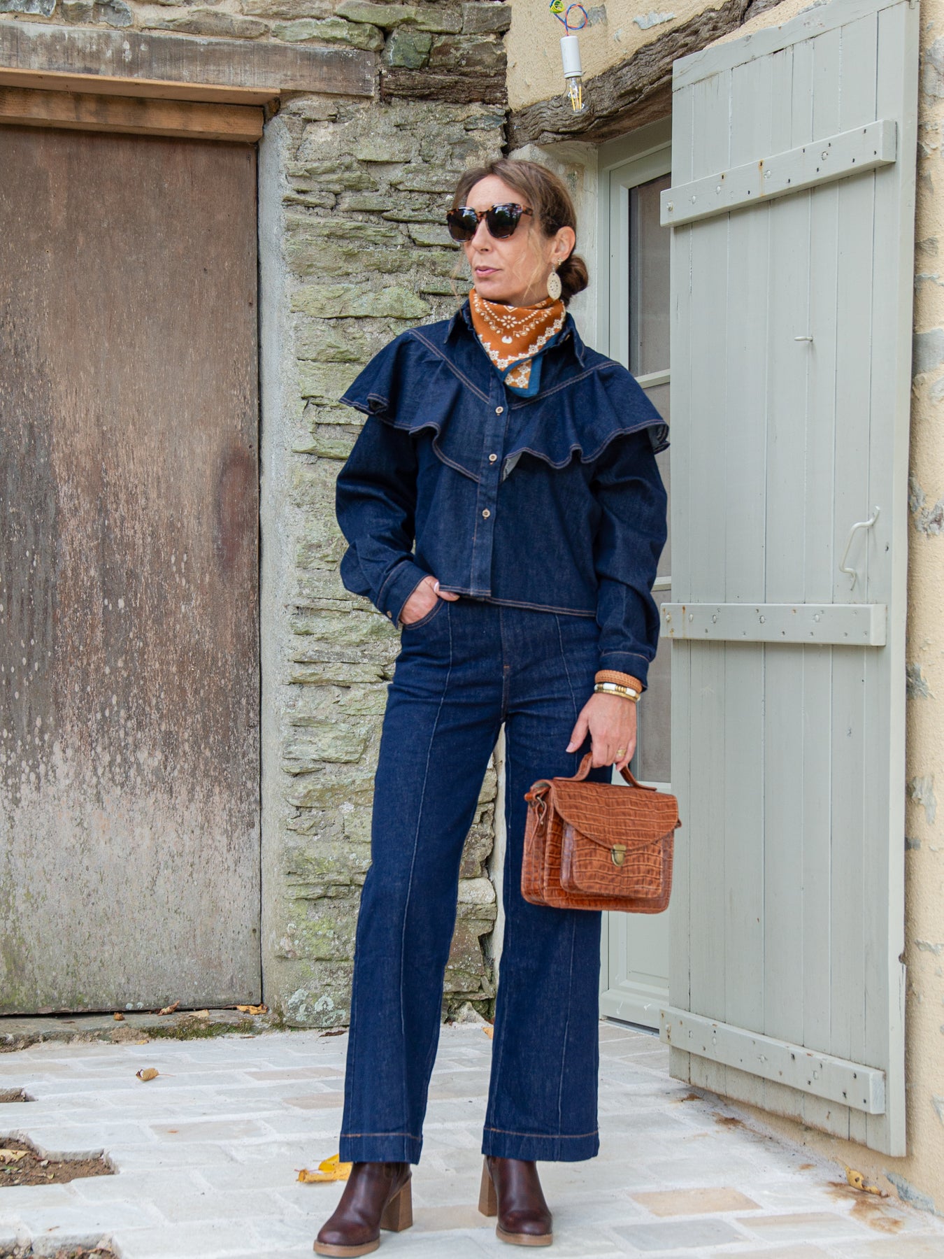 La chemise DONATELLA se ferme par 5 boutons en bois sur le devant, et ses volants sur le haut de la chemise, devant et derrière, ajoutent un détail féminin et sophistiqué. Les coutures camel apparentes soulignent la qualité de fabrication et le soin apporté aux détails.