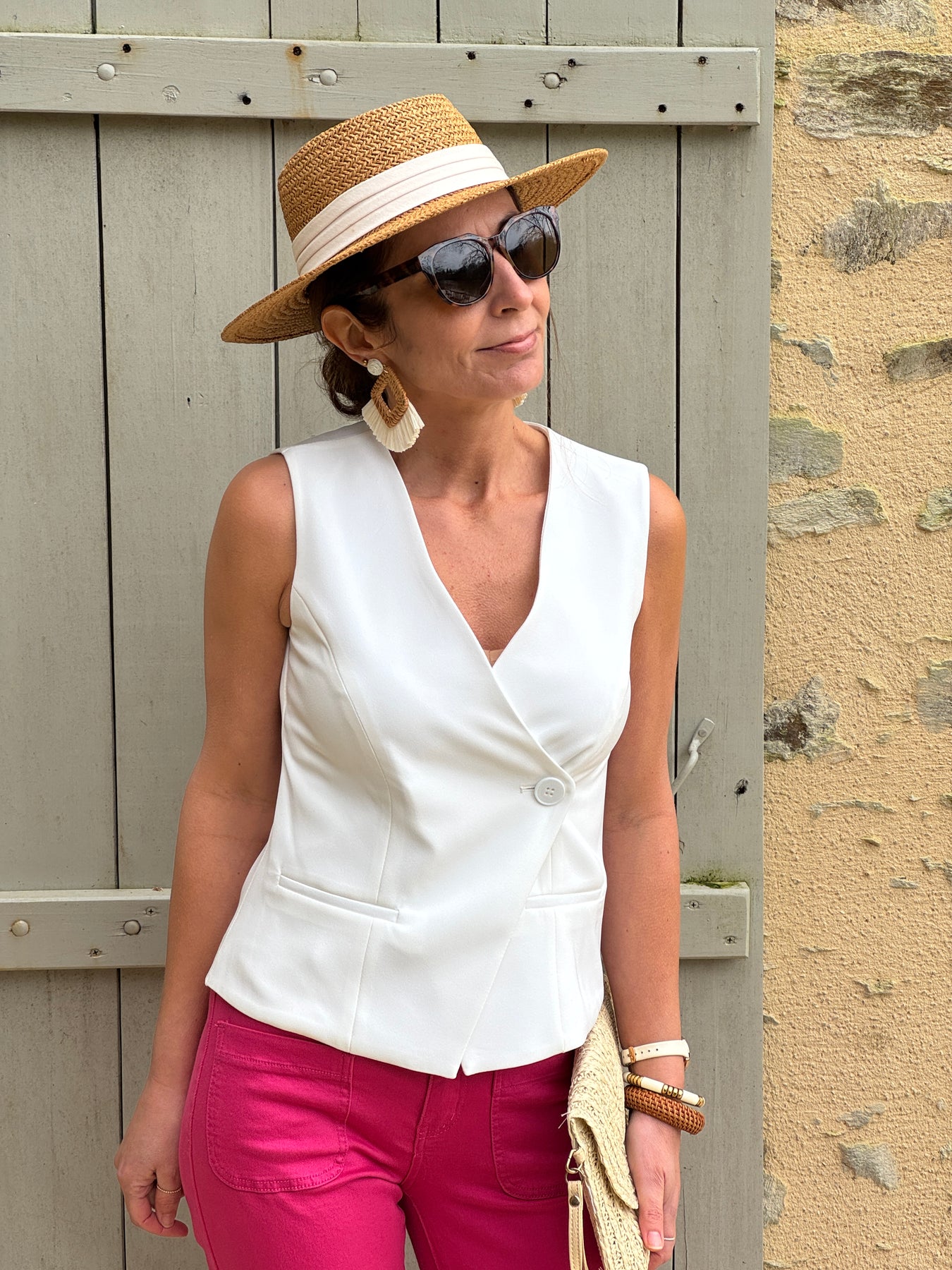 Retrouvez ce gilet blanc sans manche 1 bouton signé Hippocampe dans votre boutique De La Mode la Rochelle.