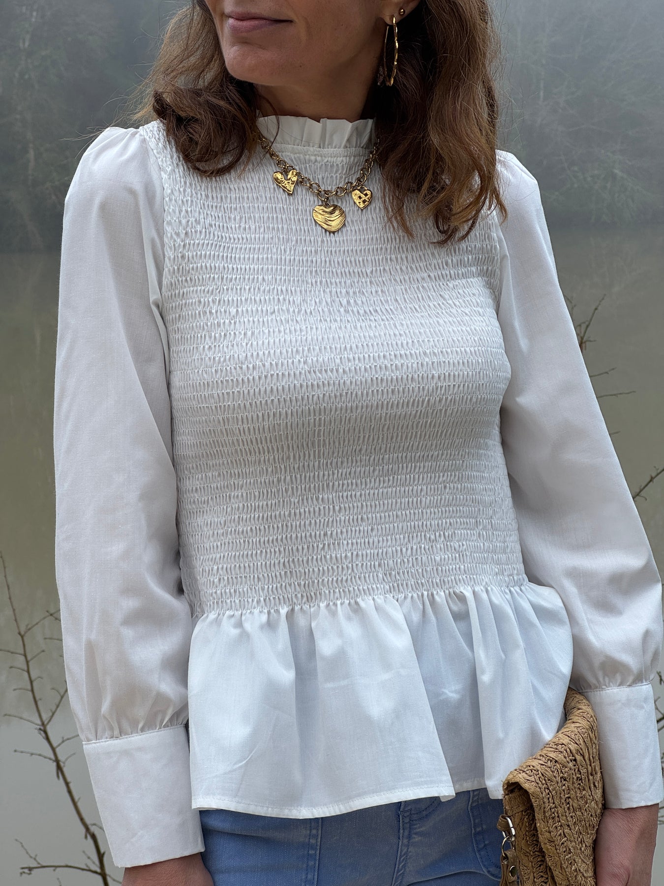Son col rond avec froufrou apporte une touche féminine et soignée, tandis que le plastron plissé à l’avant et à l’arrière structure joliment la silhouette. Les manches longues, terminées par deux boutons effet nacre gris en bas de manche, ajoutent une finition élégante et subtile.
