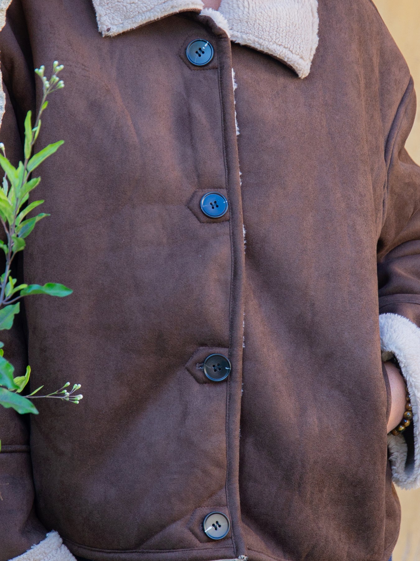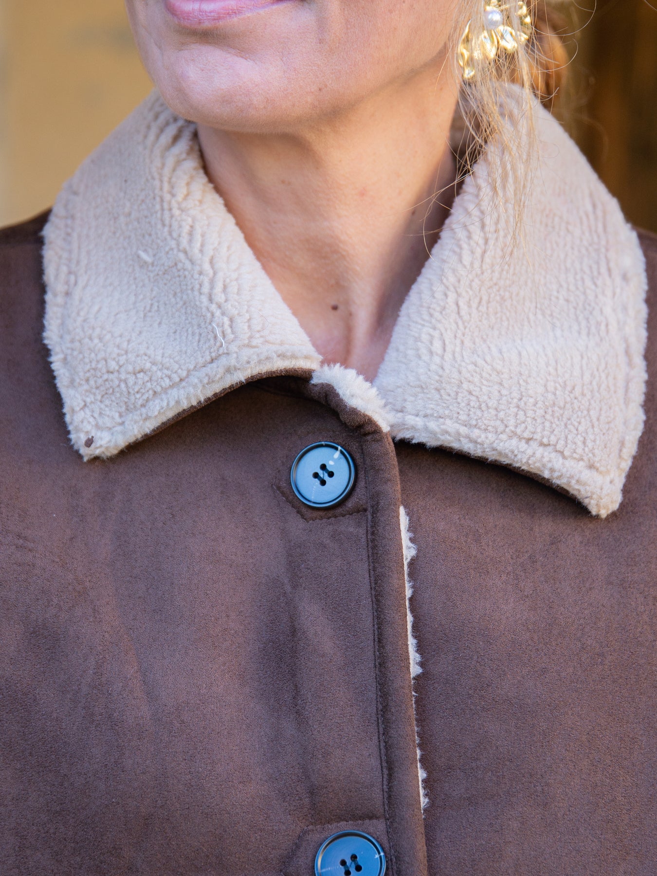 Erliegen Sie dem eleganten und warmen Stil des Cybele-Mantels in Schokoladenfarbe , der aus einem ecrufarbenen, schaffellähnlichen Material gefertigt ist, das an den Schaffell -Look erinnert und für gemütlichen und trendigen Komfort sorgt. Der Mantel ist vollständig gefüttert und bietet den ganzen Winter über optimalen Komfort.