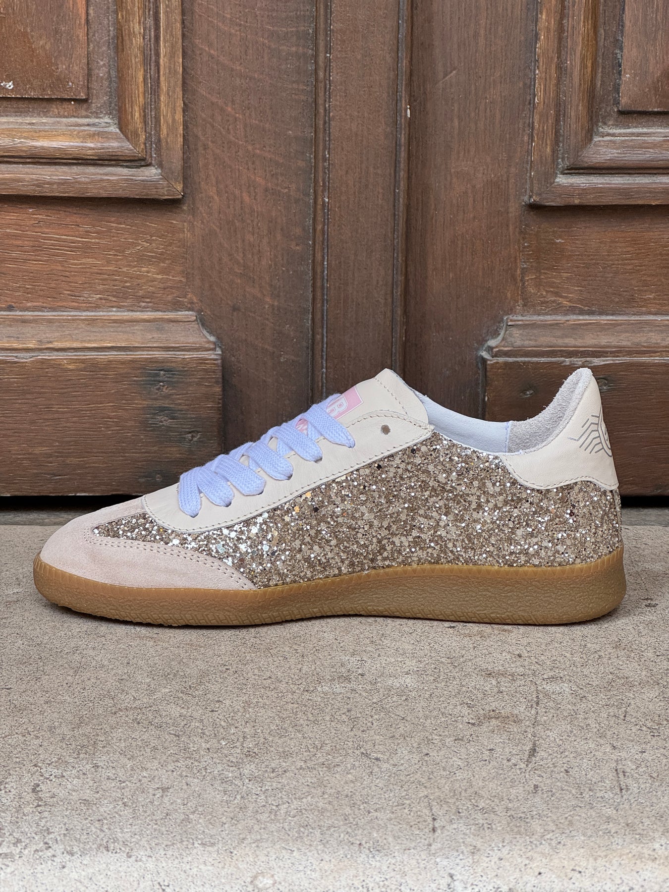 Les finitions premium font toute la différence : un éclair en cuir lisse beige sur fond paillette dorée allie praticité et style, tandis que les lacets épais blancs créent un contraste élégant. Le dessous de semelle camel vient parfaitement équilibrer les tons chauds du modèle.
