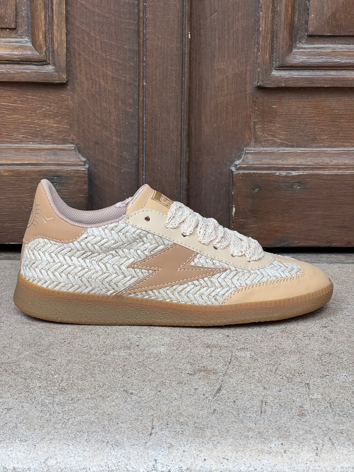 Les finitions premium renforcent le caractère du modèle : un éclair en cuir lisse marron sur fond fibre tressée beigecombine style et praticité. Les lacets épais beige effet dentelle ajoutent une note délicate et féminine. Le dessous de semelle camel vient équilibrer harmonieusement l’ensemble.