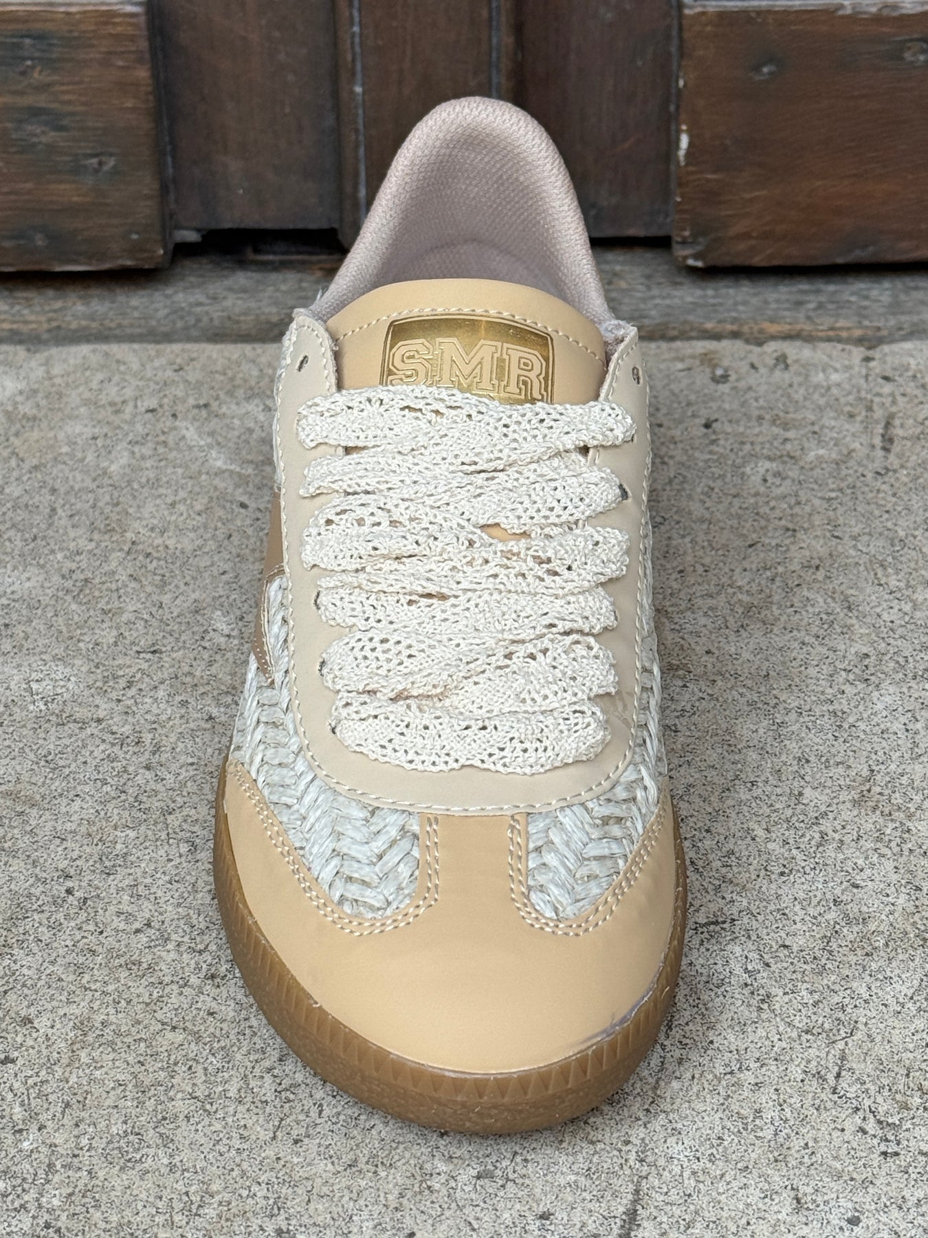 Retrouvez la basket en cuir beige avec sa fibre tressée et ses lacets effet dentelle Emily 507 signé Semerdjian dans votre boutique De La Mode la Rochelle.