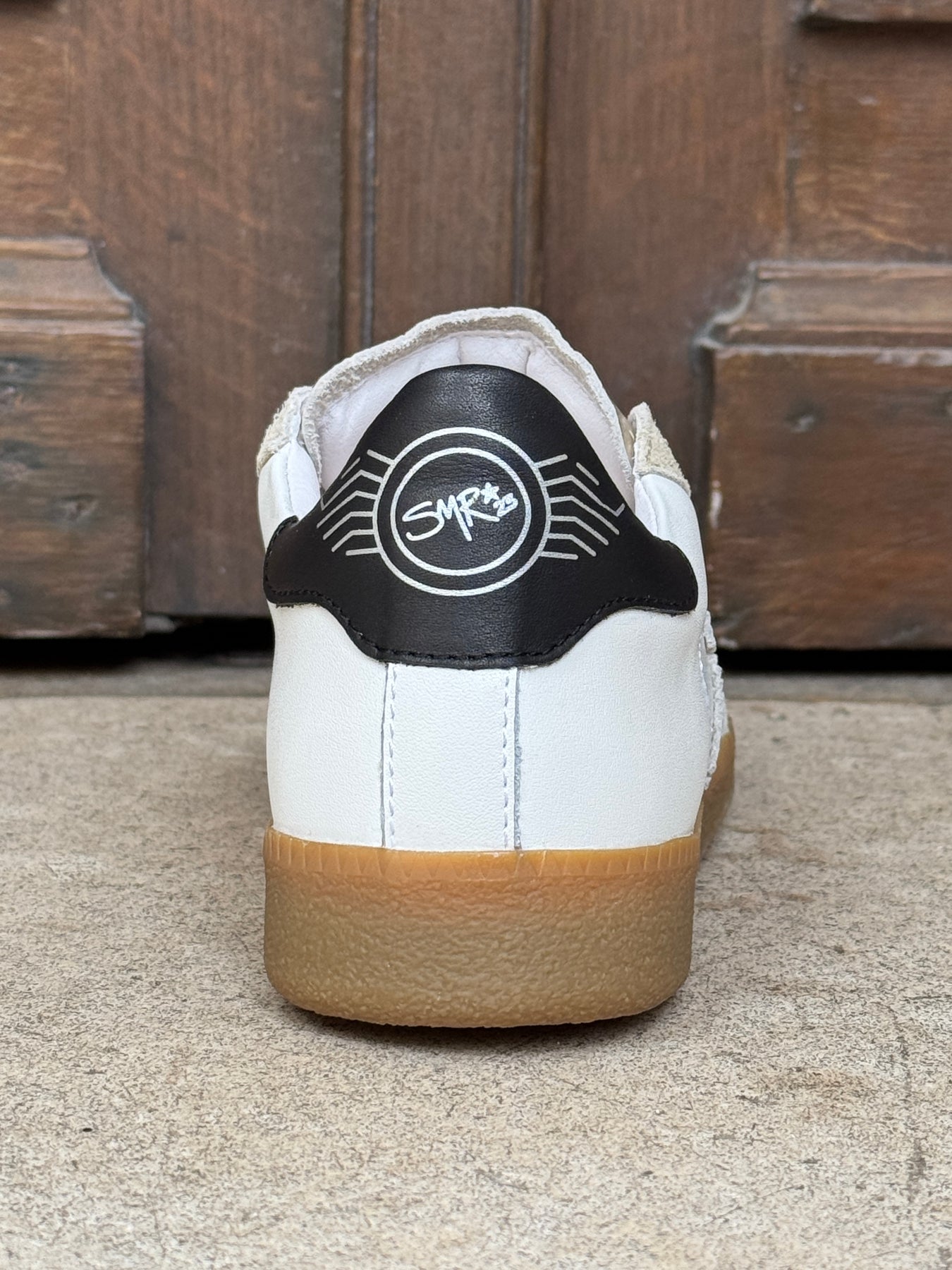 À l’arrière, le logo SMR gris sur fond noir apporte une finition contrastée et moderne. La languette en cuir irisé doré avec logo SMR blanc sur fond bleu signe l’identité forte de la marque. Cette basket Semerdjian, marque française, est fabriquée au Portugal, garantissant un savoir-faire européen et des finitions haut de gamme.