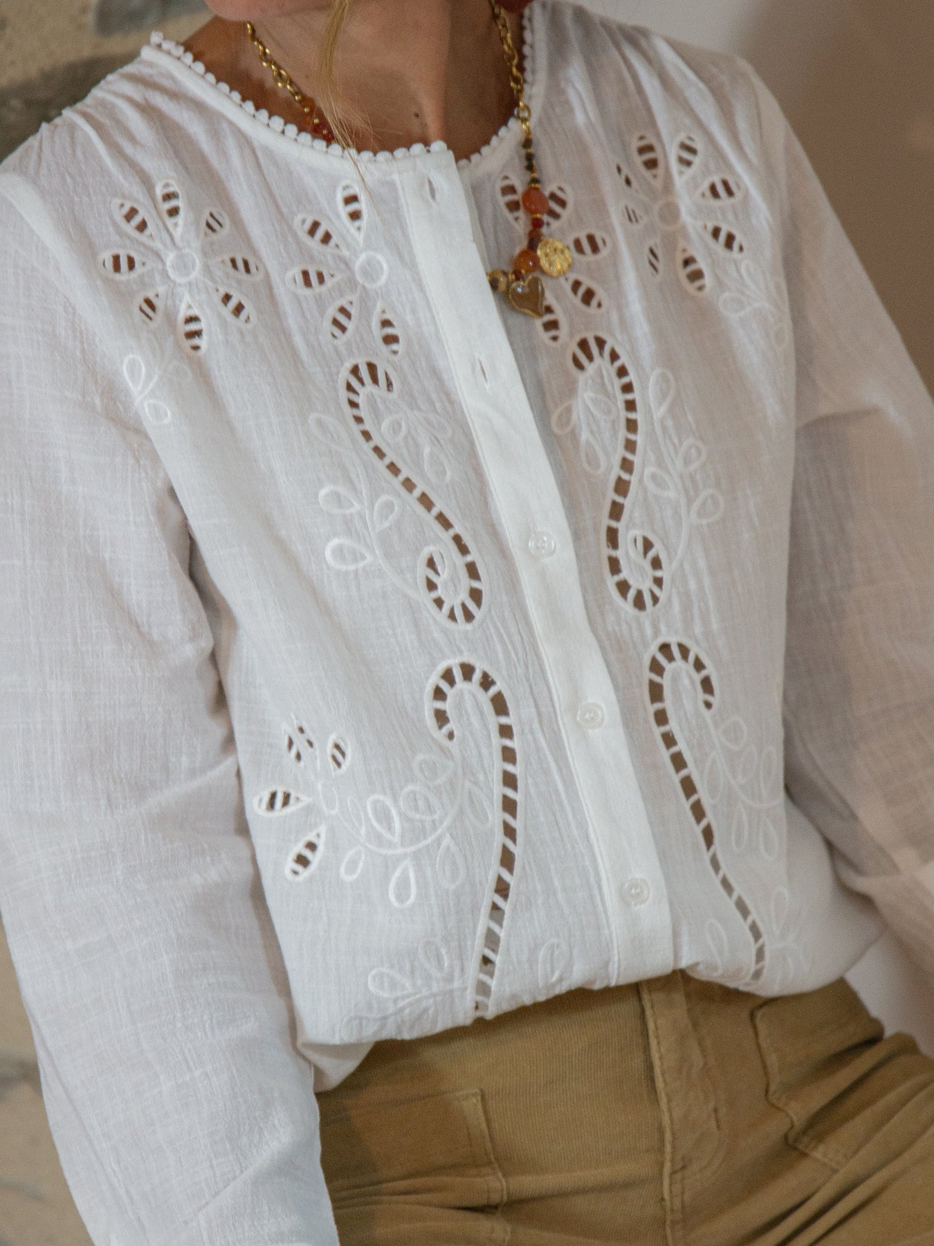 Finden Sie diese weiße Bluse mit der CLEA- Blumenstickerei in Ihrer De La Mode-Boutique in La Rochelle .