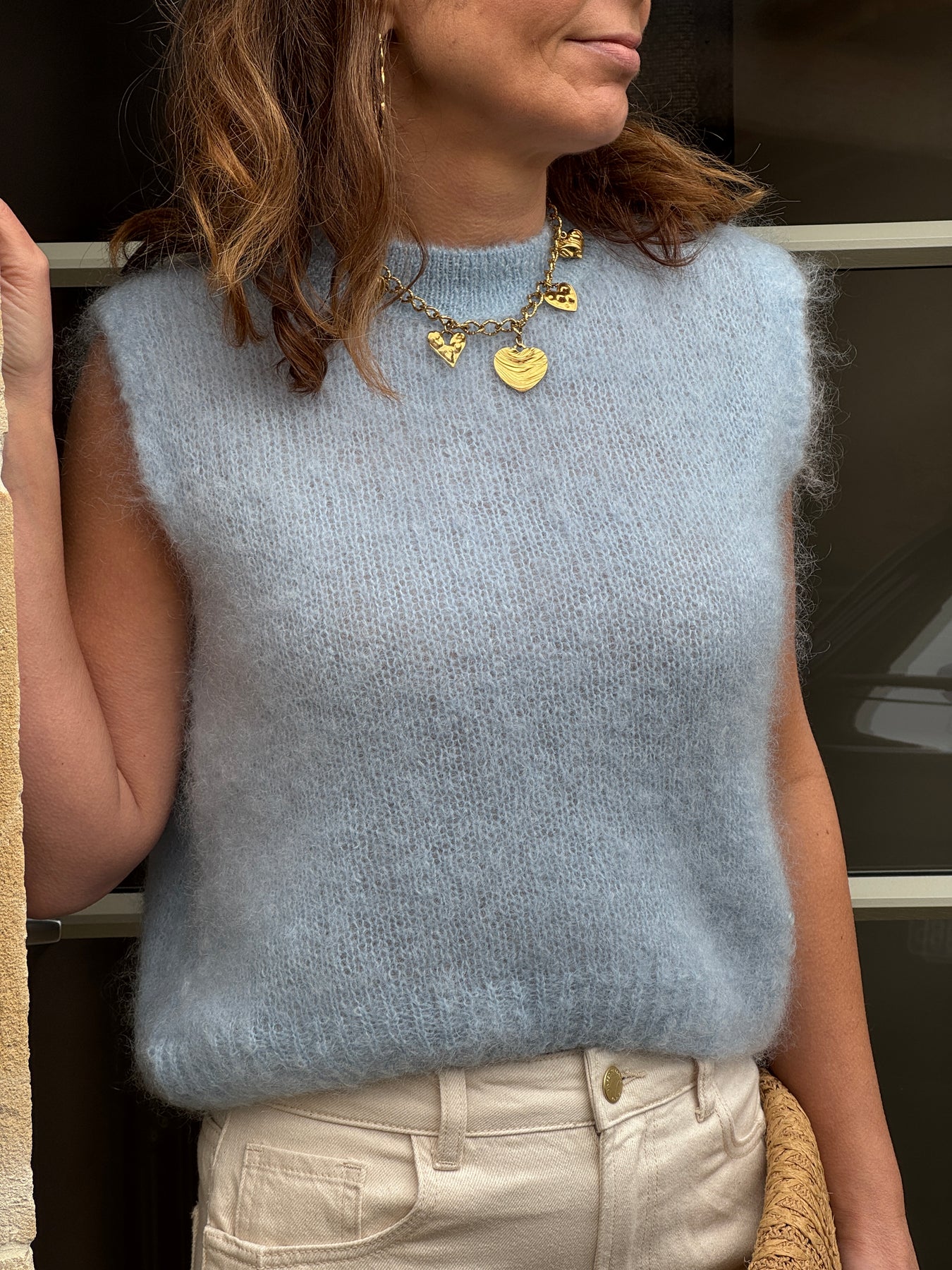 Pull sans manches femme bleu ciel col rond en maille douce idéal pour la mi-saison