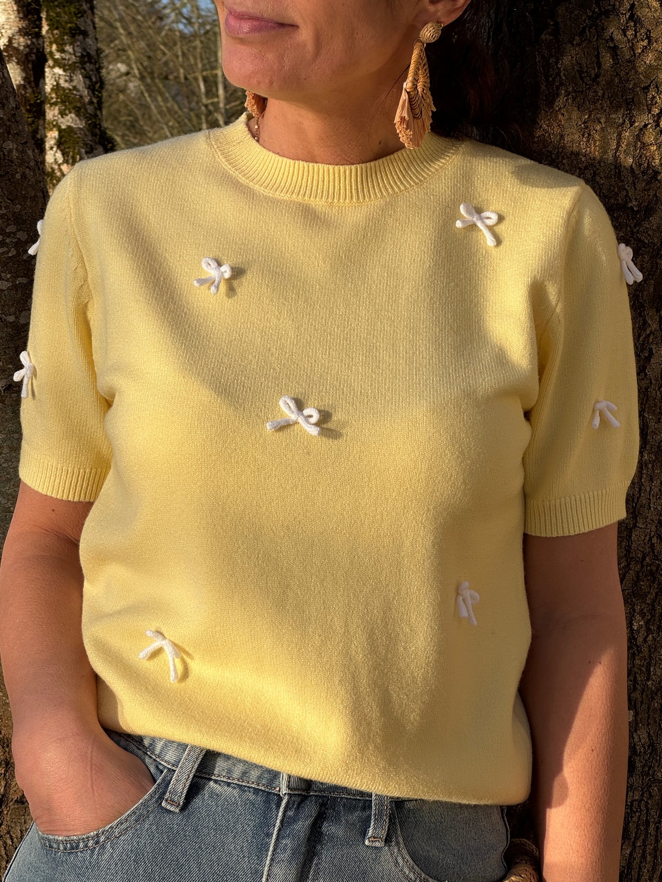 Das Rundhalspullover zeichnet sich aus durch Kurzarm und sein bequemer Schnitt, ideal für die Übergangszeit oder zum Tragen unter einer Jacke. Sein charakteristisches Detail: Kleine weiße Schleifen im Relief auf gelbem Grund verleihen dem Design eine feine, originelle und elegante Note.