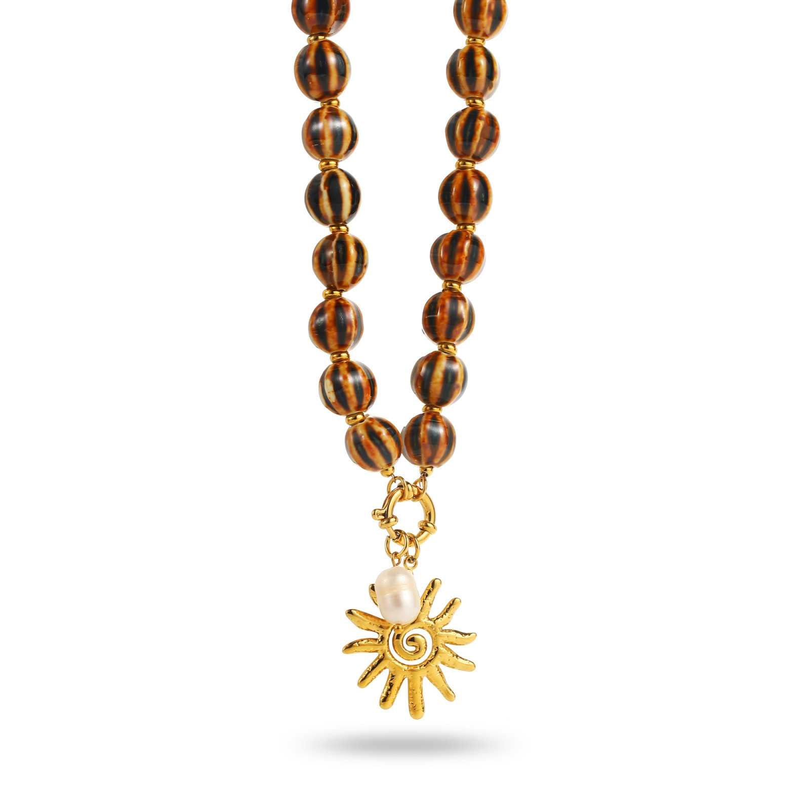 Brown and black zebra bead necklace with gold sun charm and white pearl
