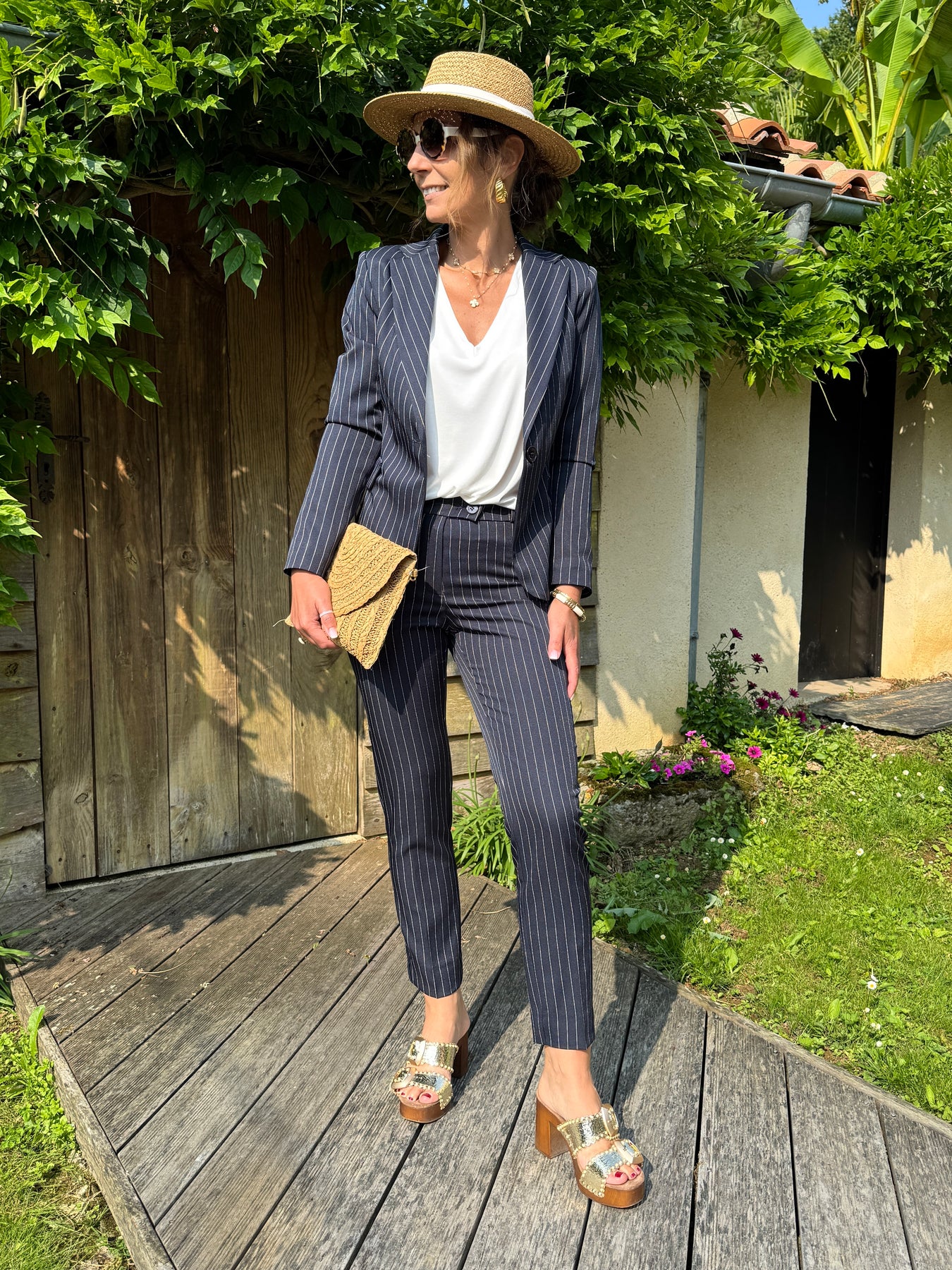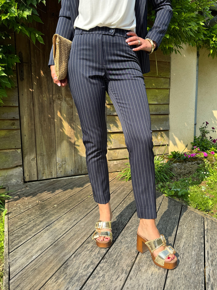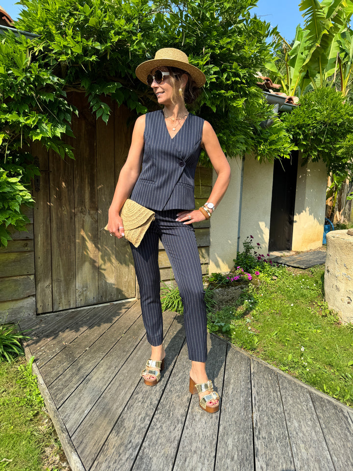 You can pair these pants with our DIANA navy jacket with white Hippocampe stripes and our one-button navy vest with white stripes.
