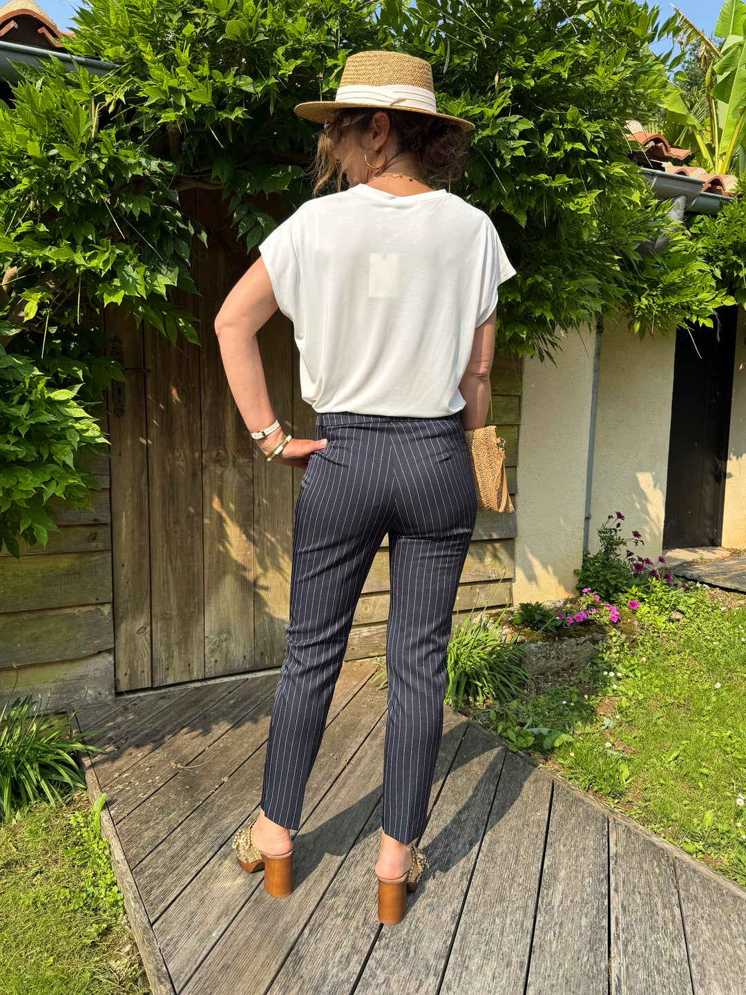 Our LIVERPOOL trousers from Hippocampe are a stylish and modern piece that will add a touch of sophistication to your wardrobe. These navy trousers with white stripes are designed with a cigarette cut , perfect for a sleek, elongated silhouette. Their timeless cut makes them a must-have for any occasion, whether it's a day at the office or a casual outing.