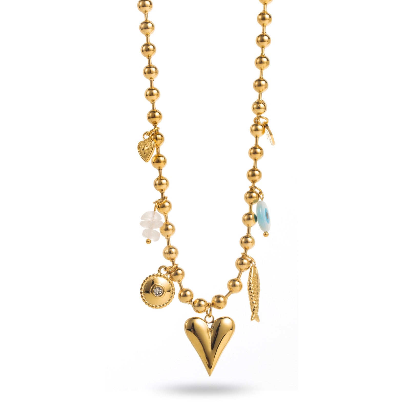 Collier breloques dorées cœur & œil – chaîne à petites perles en acier inoxydable