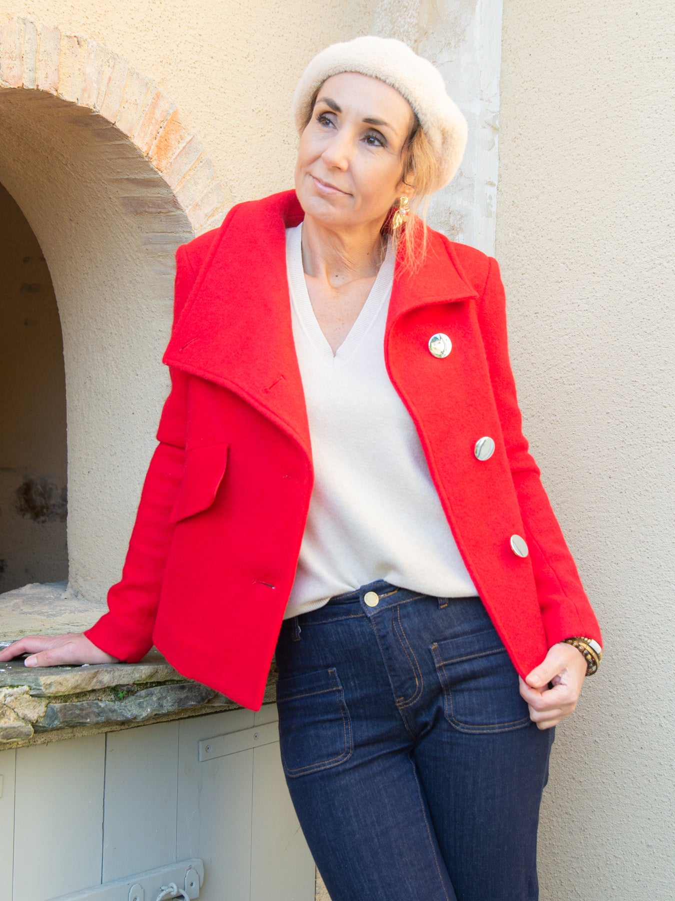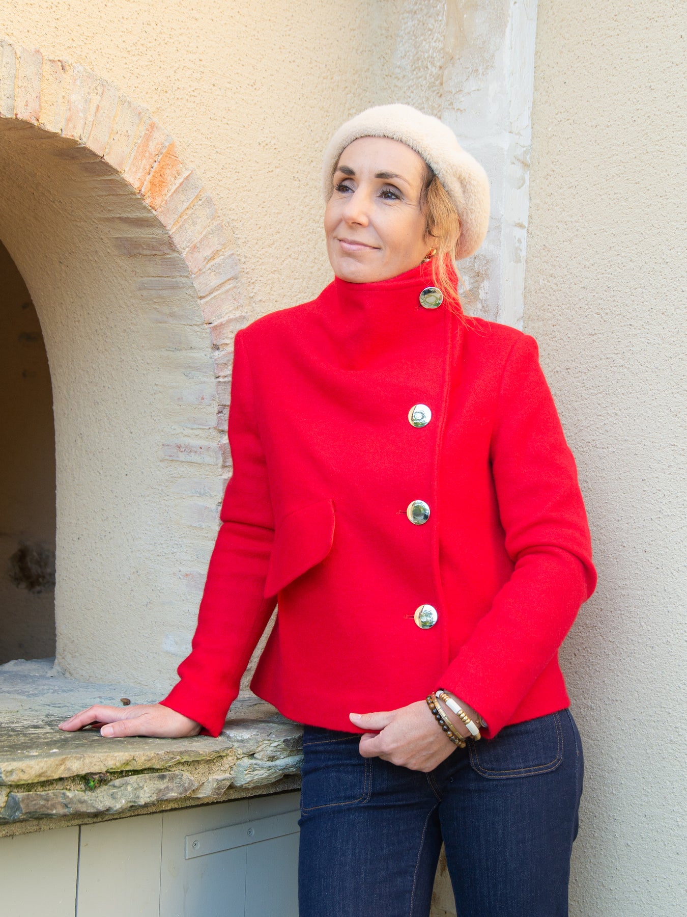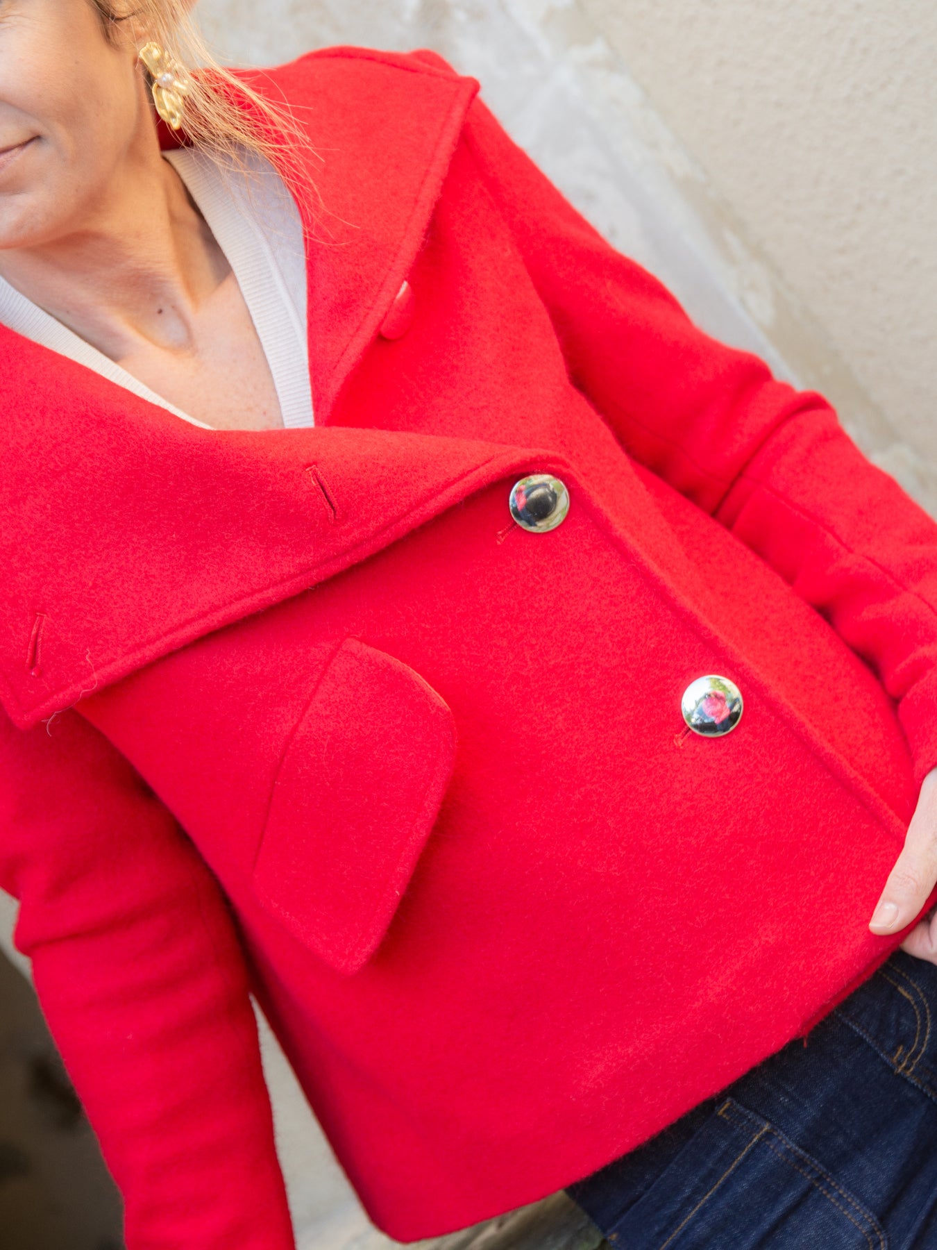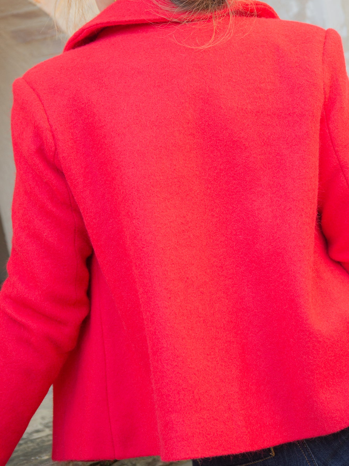 Confectionné en matière effet feutre (80 % polyester, 20 % laine), ce caban offre chaleur et structure, idéal pour les saisons fraîches. Sa coupe courte et ses détails travaillés en font une pièce incontournable de votre garde-robe.