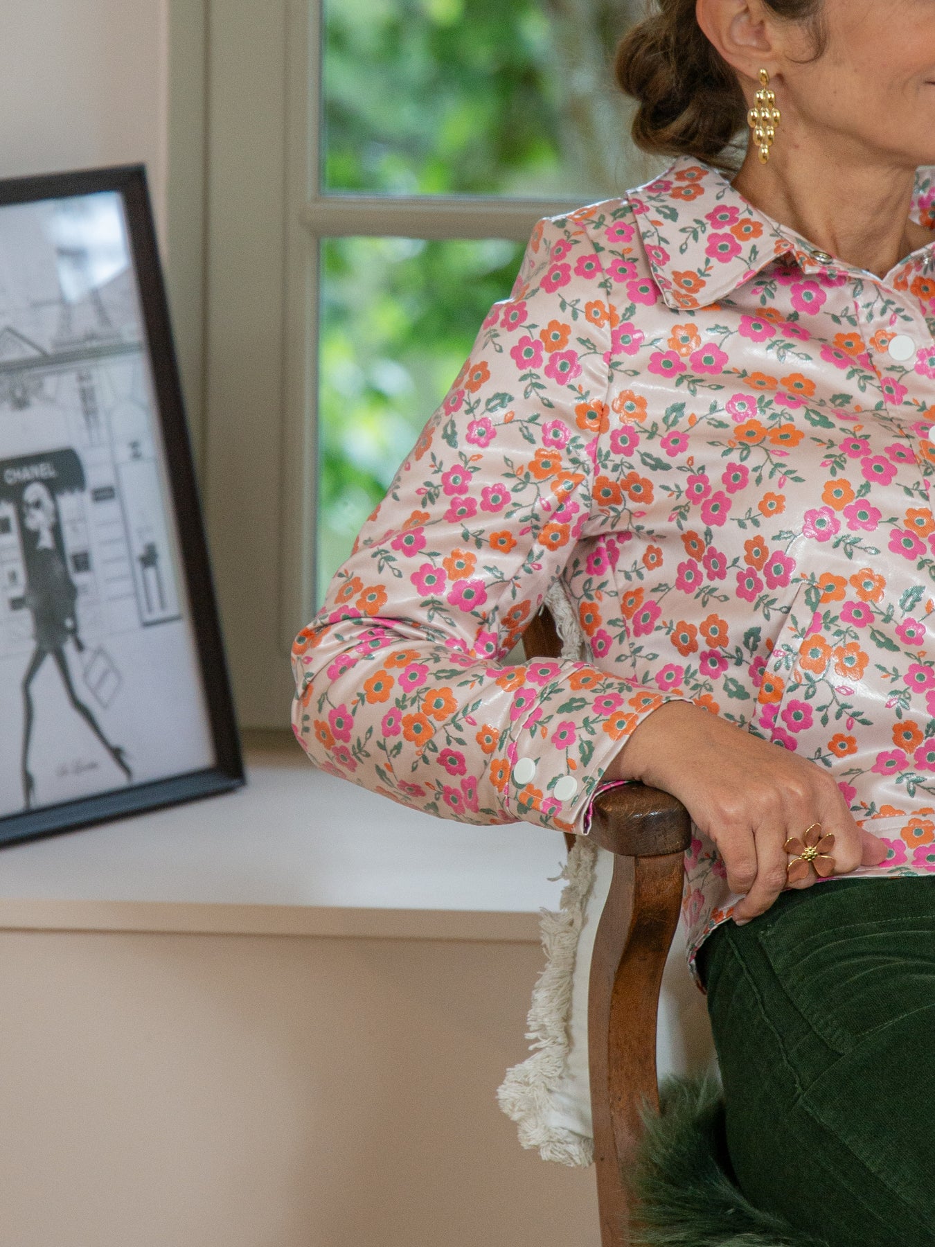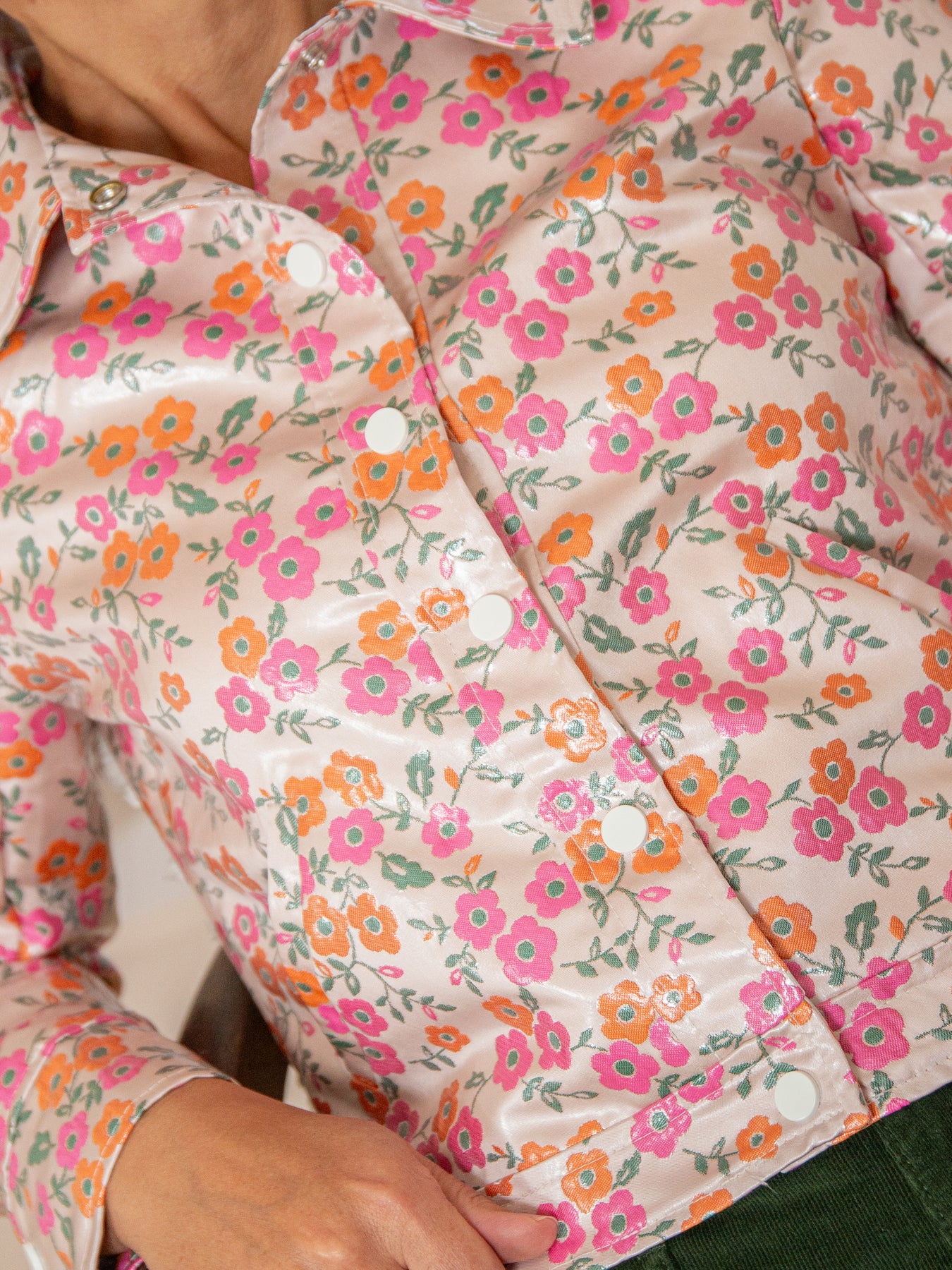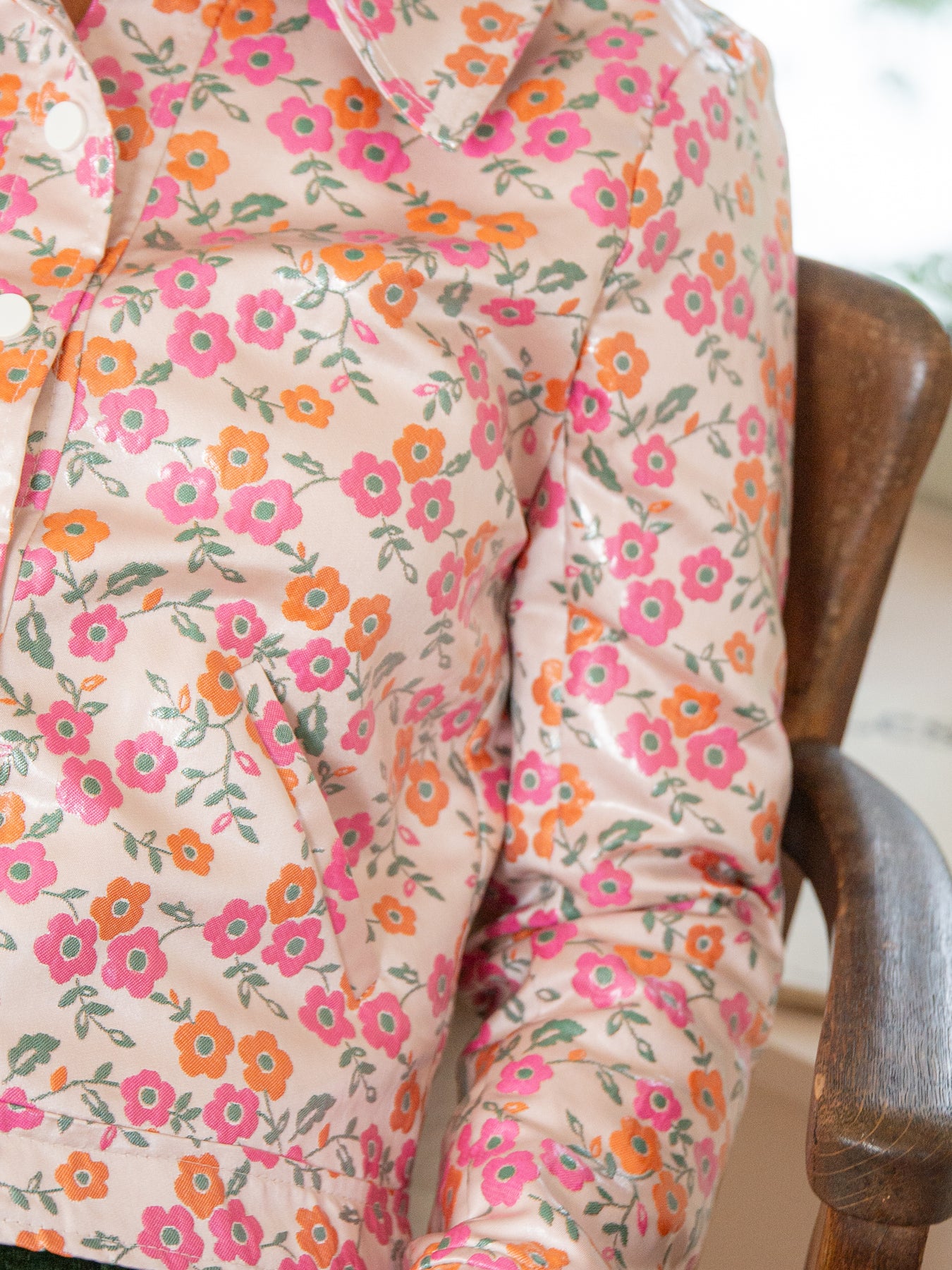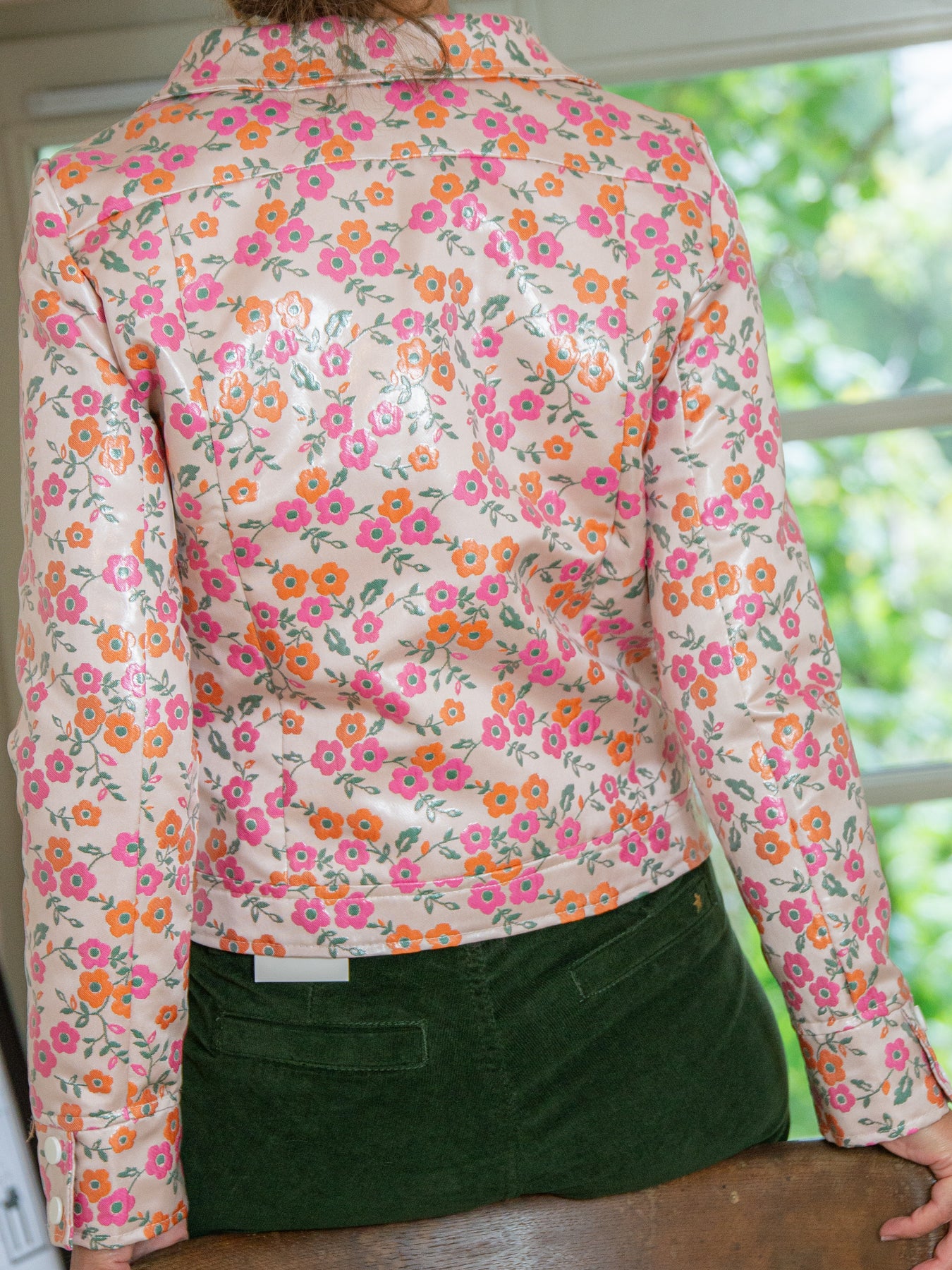 Le motif floral jacquard en rose et orange avec feuillage vert sur fond écru apporte une touche originale et féminine à votre tenue, parfaite pour illuminer vos looks de saison. Polyvalent et chic, ce blouson jacquard enduit se marie facilement avec un jean, un pantalon droit ou une jupe pour un style moderne et élégant.