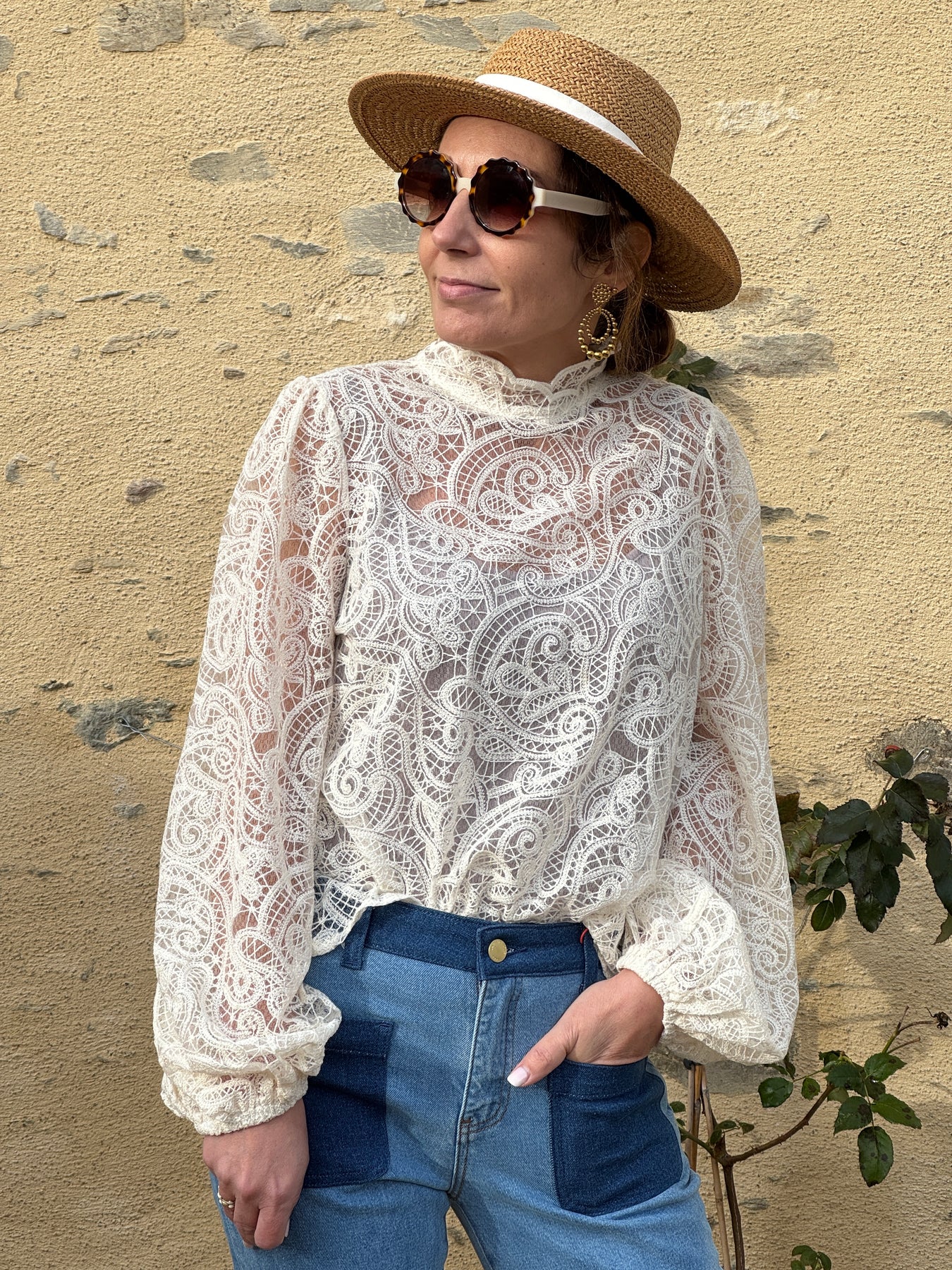Blouse dentelle motif cachemire col montant écru AGLAE