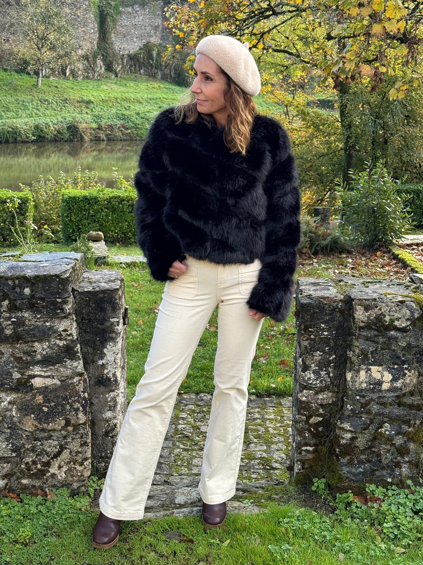 Retrouvez ce manteau noir court en fausse fourrure MARTA dans votre boutique De La Mode la Rochelle.