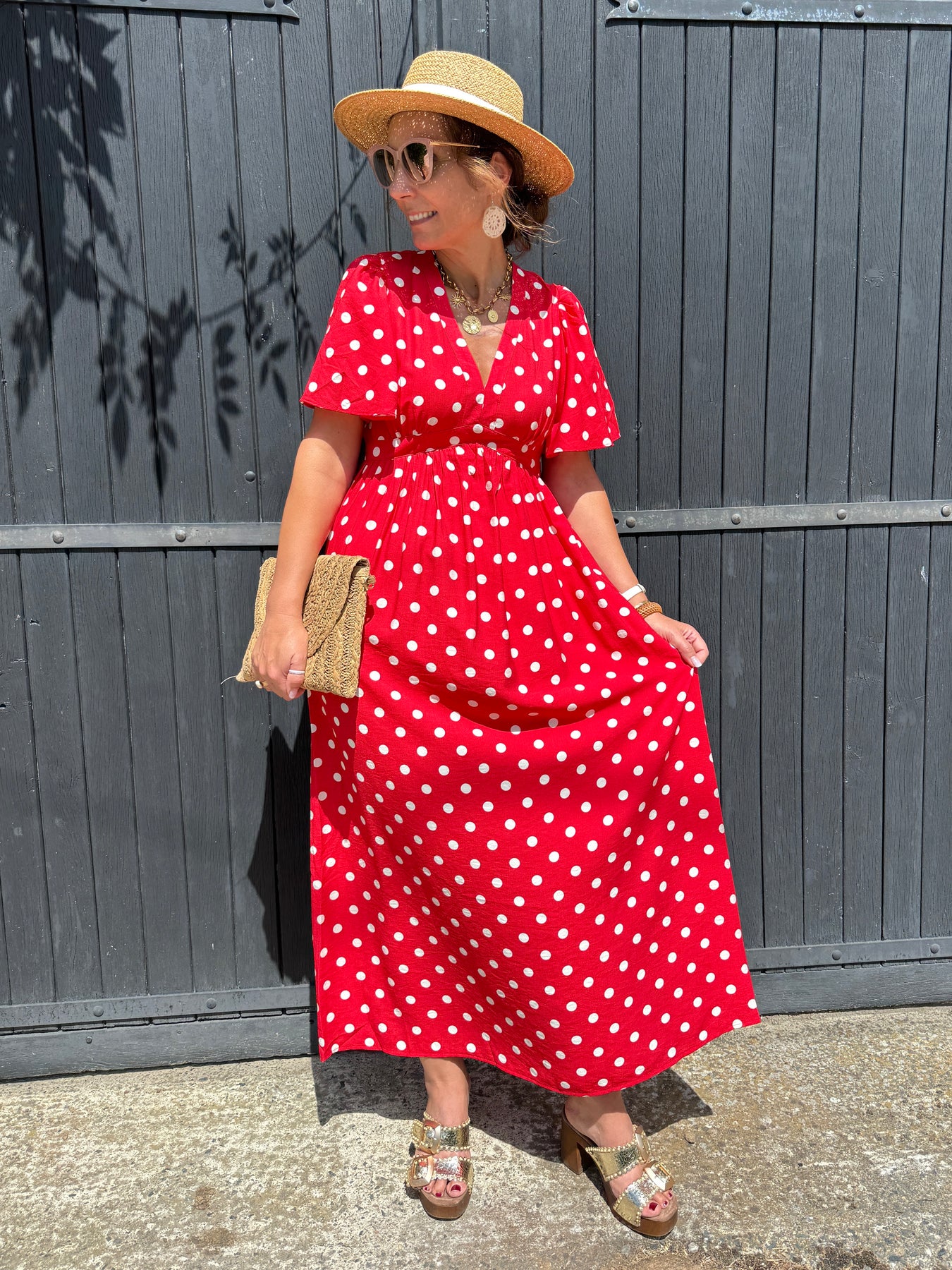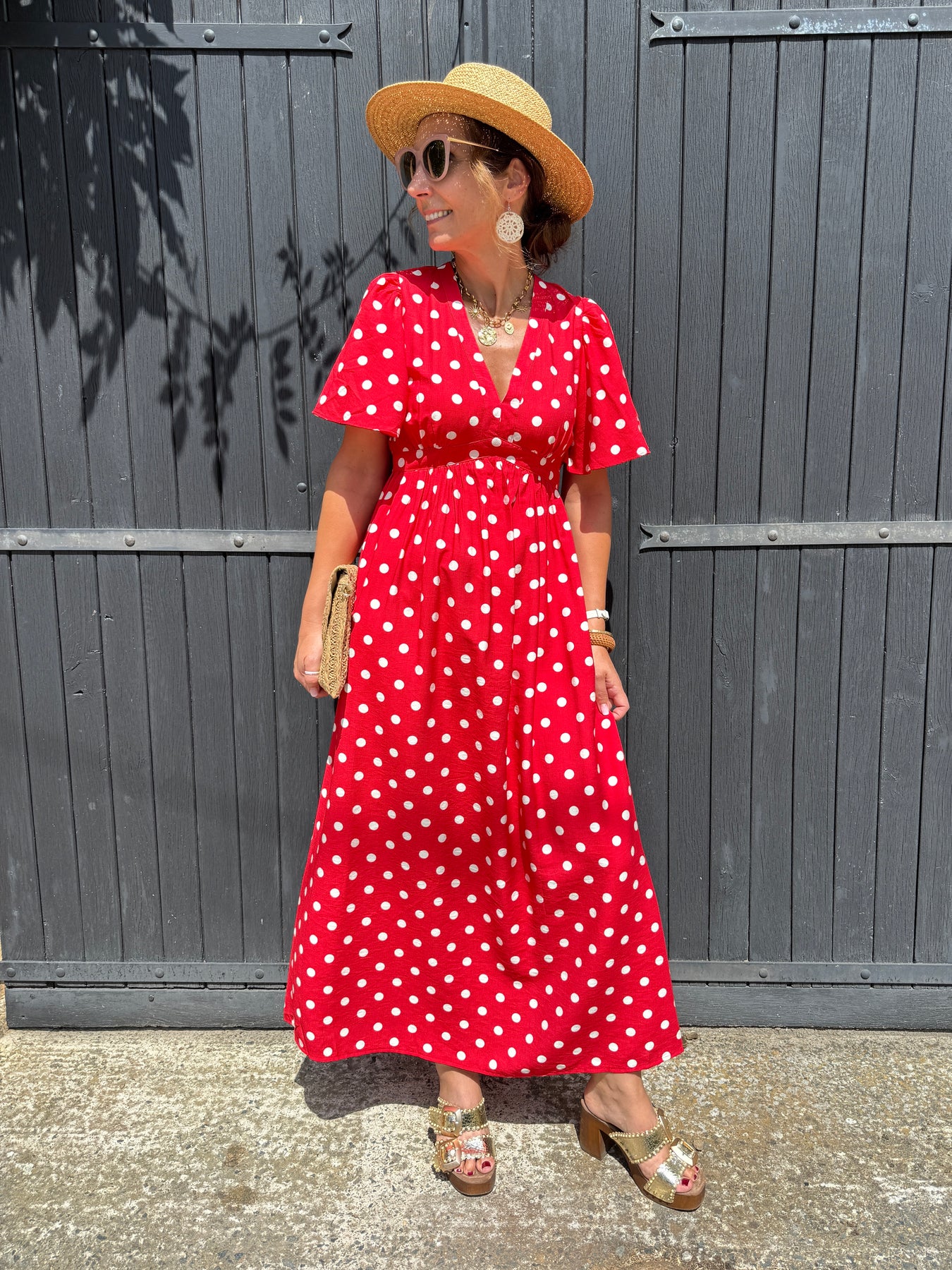 Retrouvez cette robe longue rouge à pois crème JEANNE dans votre boutique De La Mode la Rochelle.