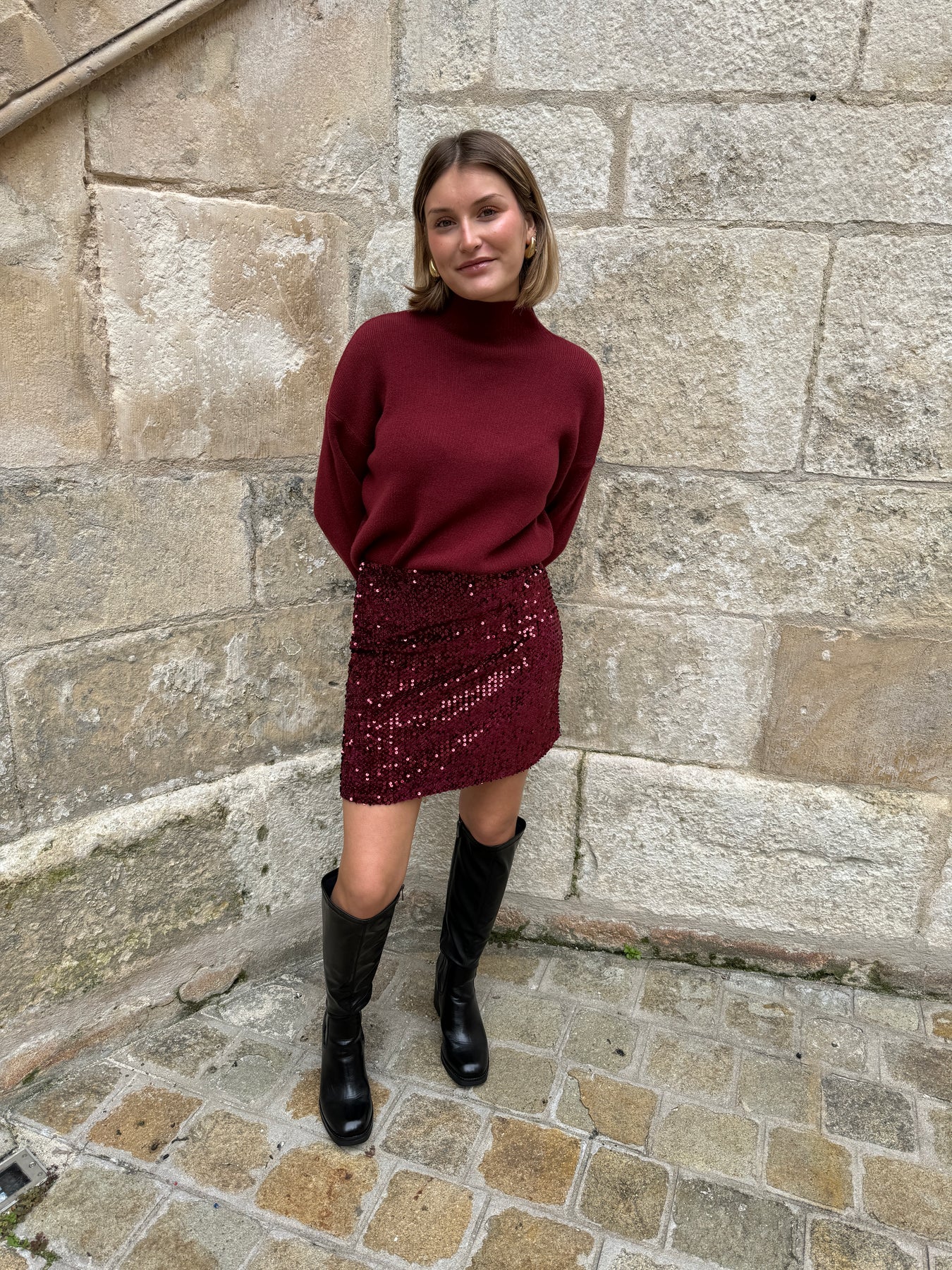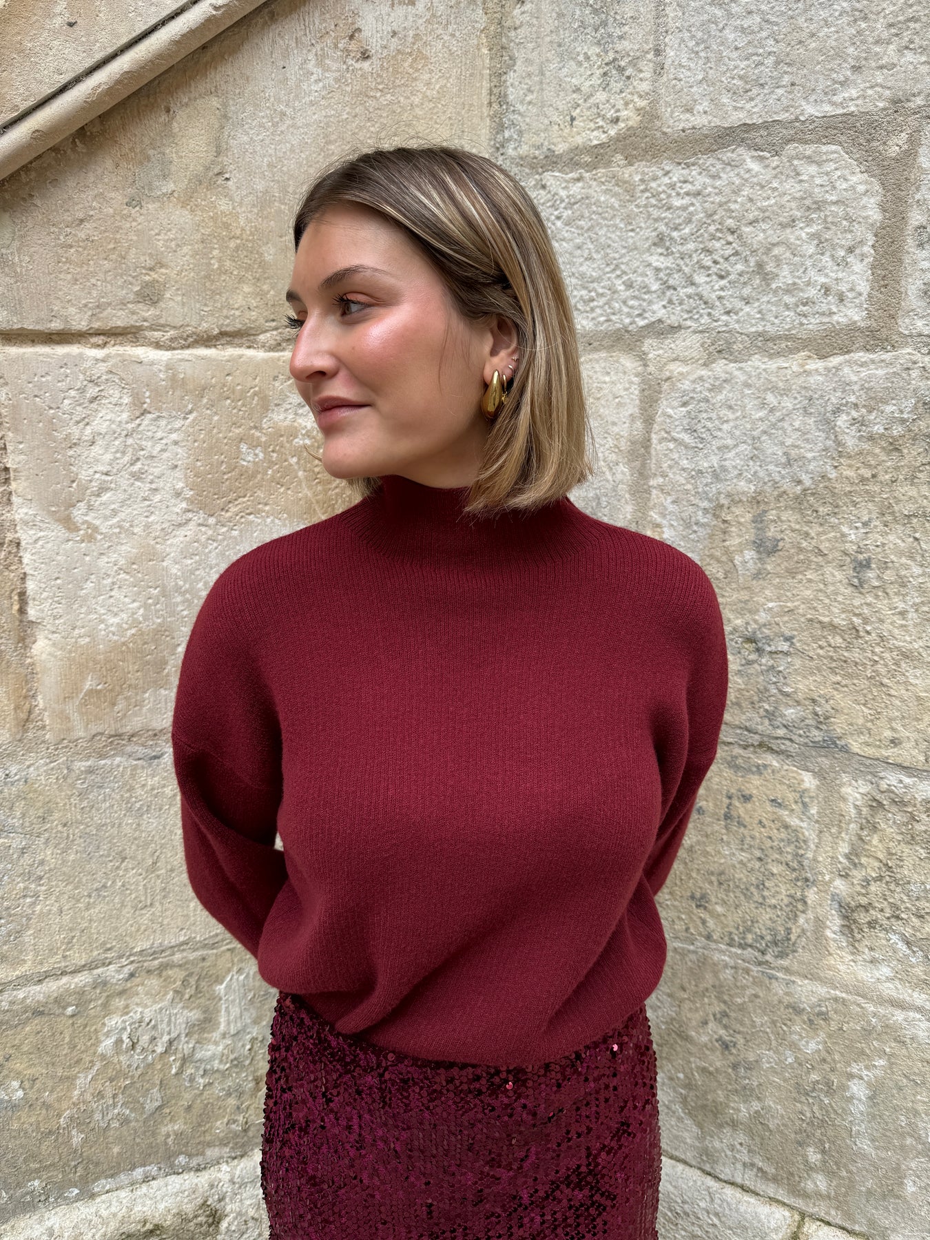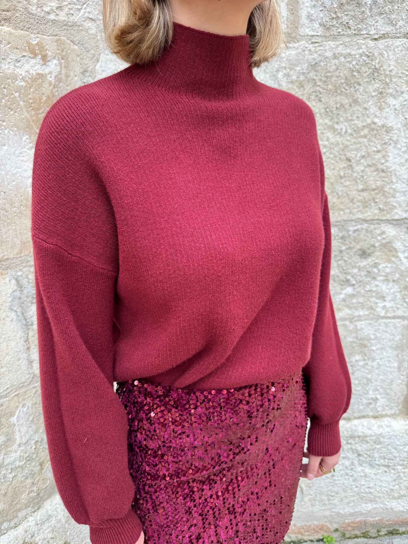 Retrouvez ce pull bordeaux col cheminée dans vos boutiques De La Mode la Rochelle.