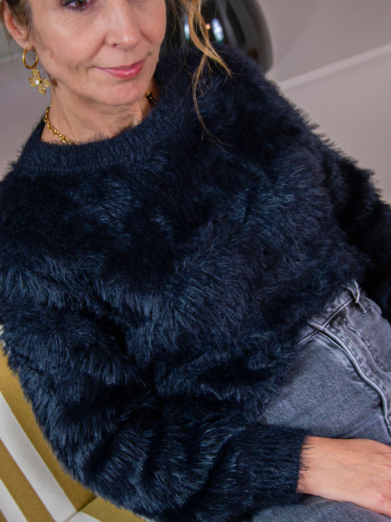 Confectionné avec un effet poils long, ce pull offre une texture chaude et agréable au toucher, idéale pour allier confort et style au quotidien. Les manches longues garantissent une couvrance optimale et un look élégant et cosy.