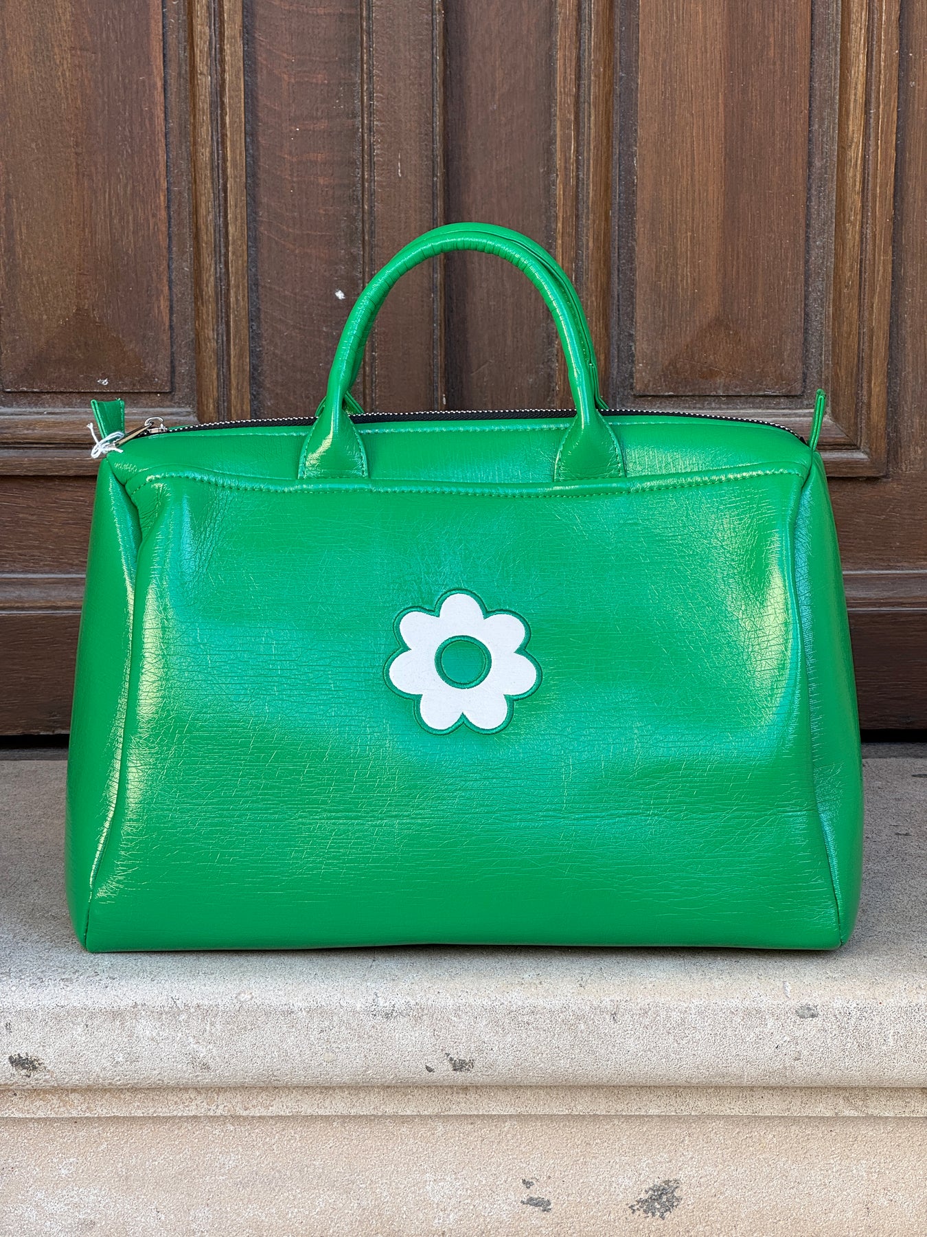 Sa forme sac bowling iconique en fait un sac à main idéal, spacieux sans être encombrant. On adore son détail signature : une marguerite blanche en vinyle apposée sur le devant, emblème de la marque Hippocampe, qui apporte une touche joyeuse et distinctive.