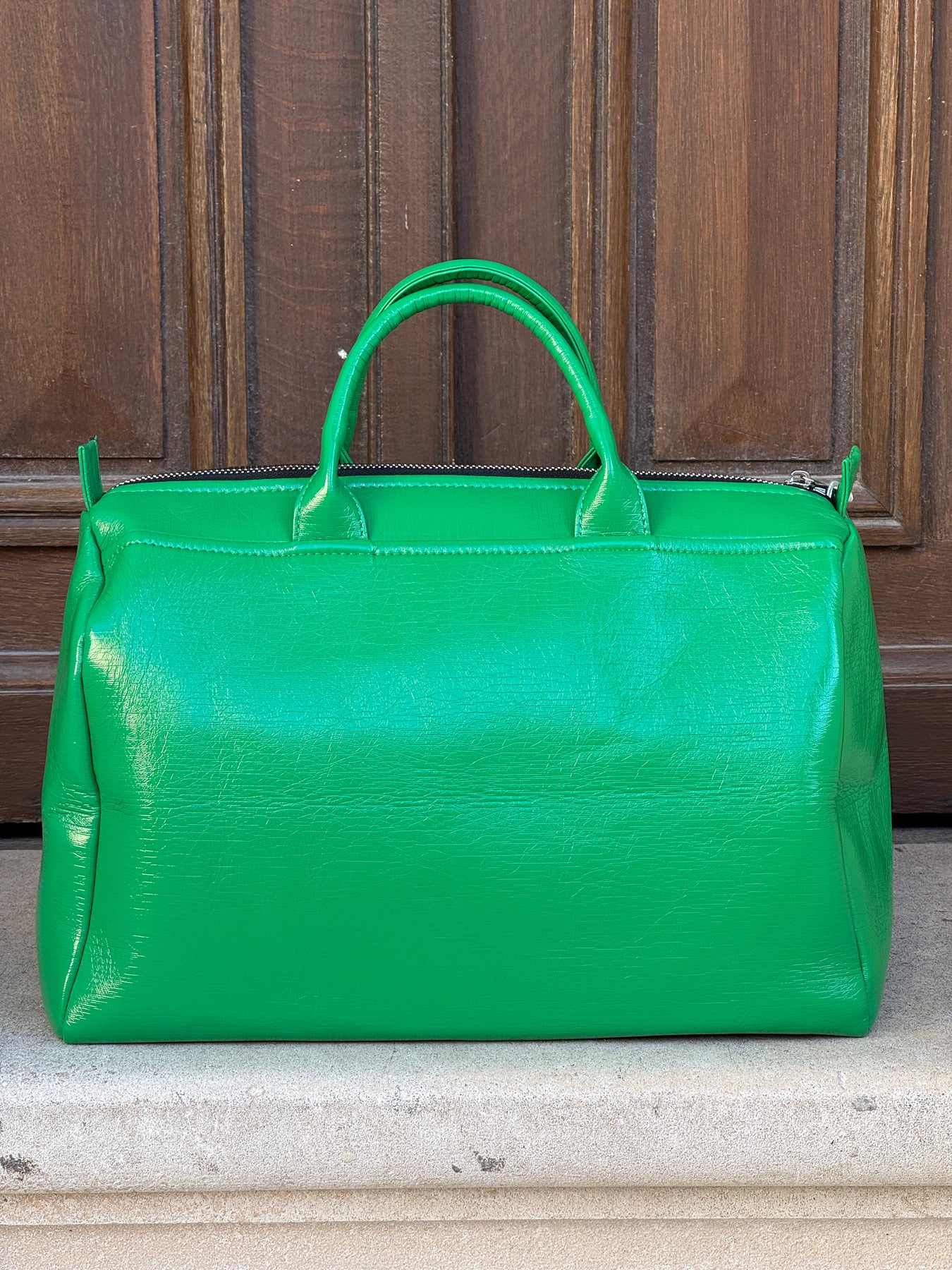 Retrouvez ce sac à main en vinyle vert brésil BOWLING signé Hippocampe dans votre boutique De La Mode la Rochelle.