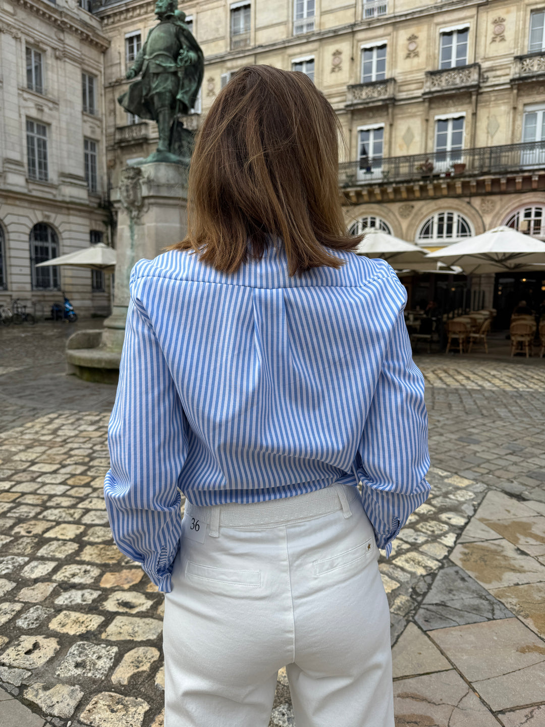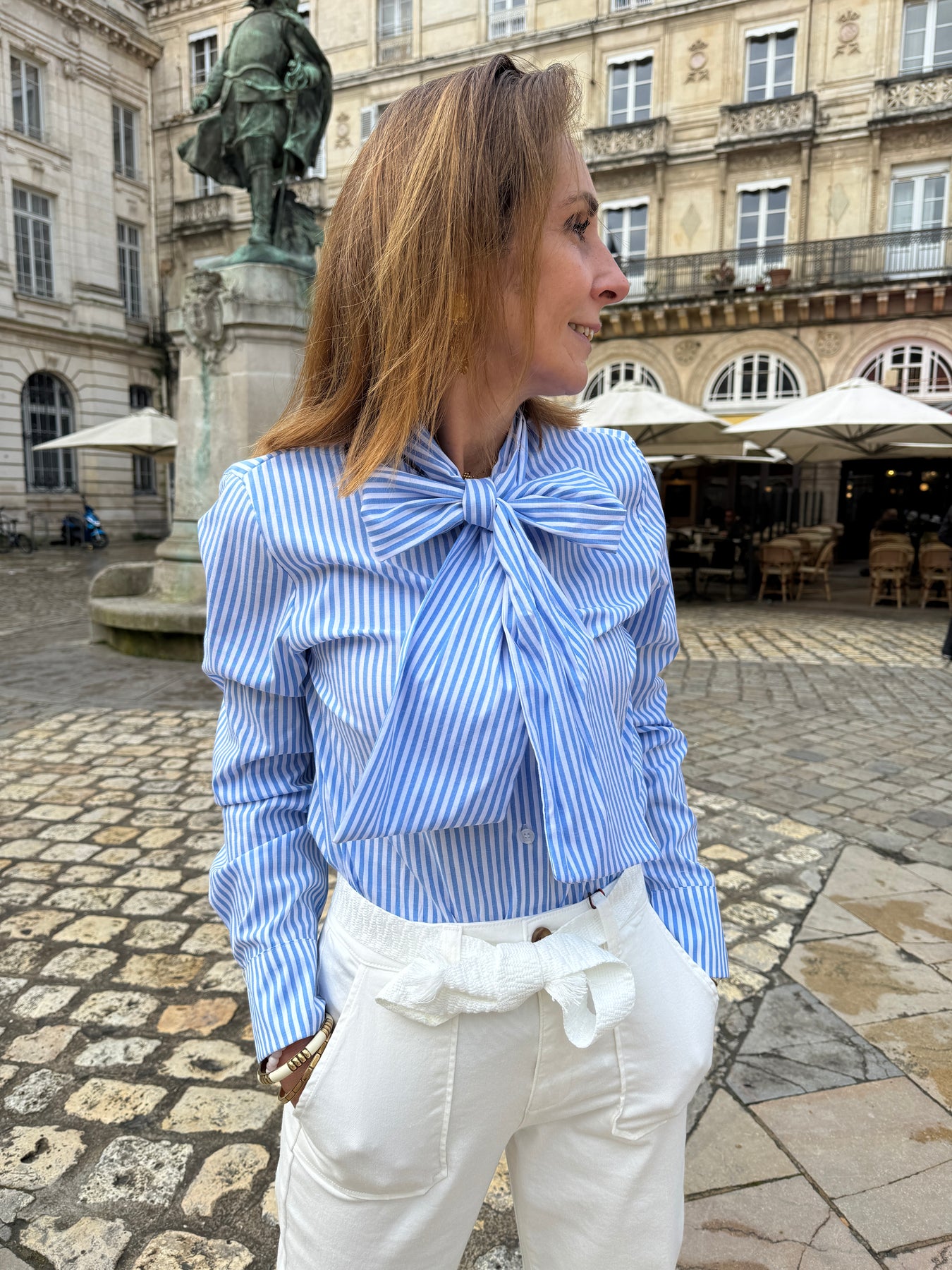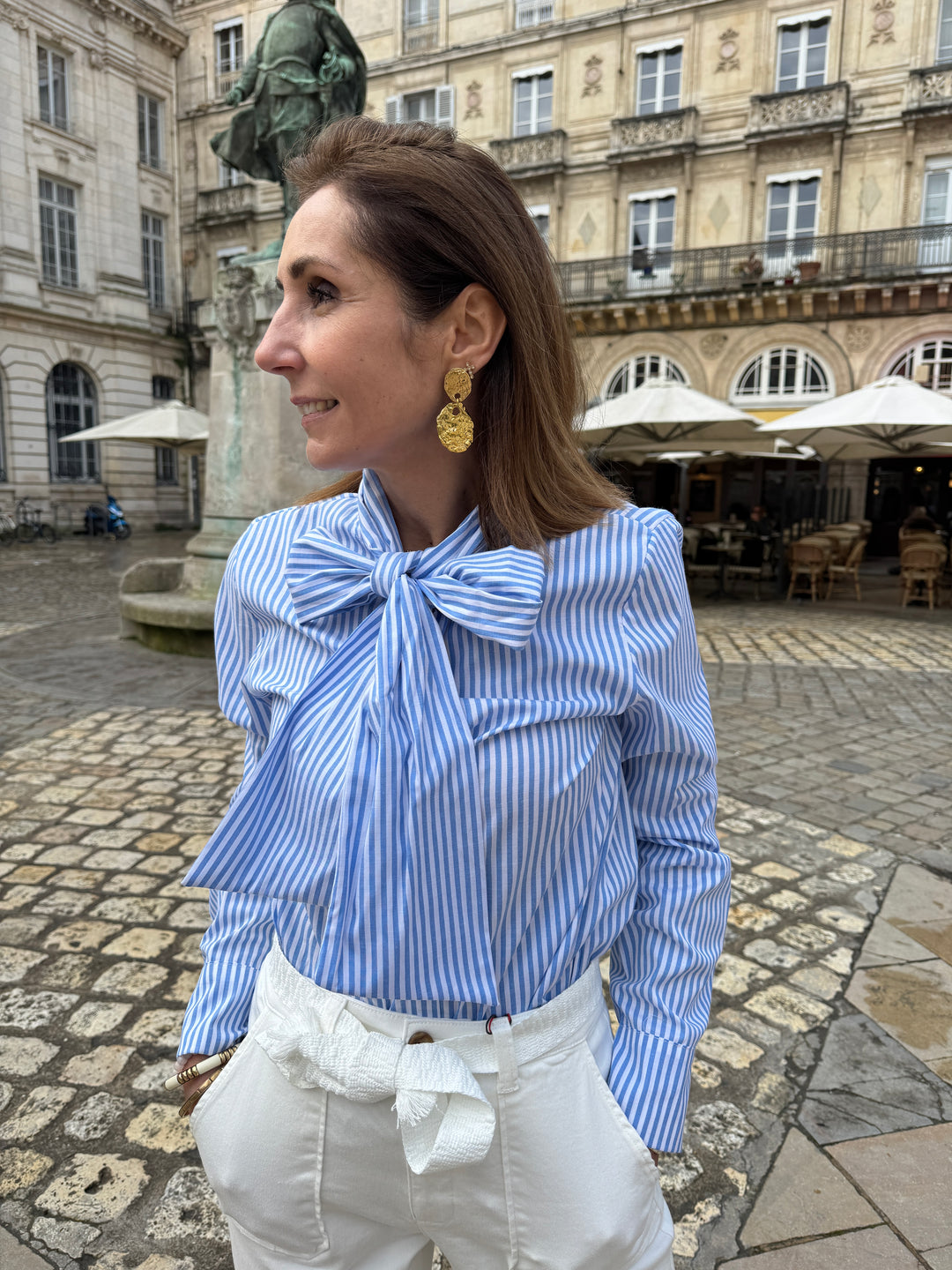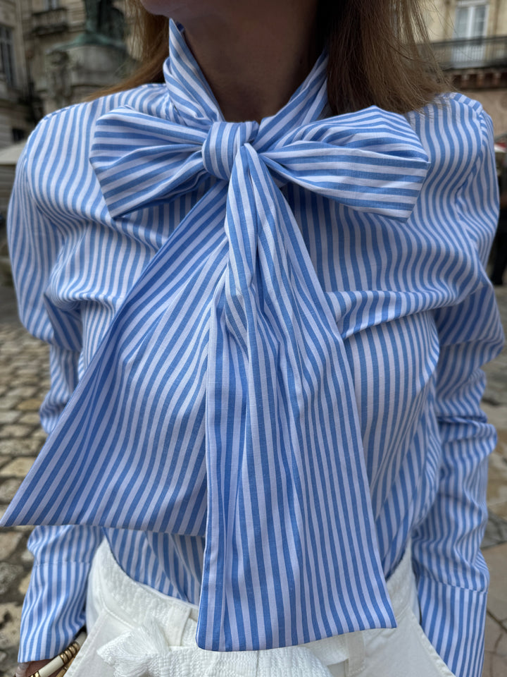 Retrouvez cette chemise à rayures bleu ciel et blanches avec son col lavallière dans votre boutique De La Mode la Rochelle.