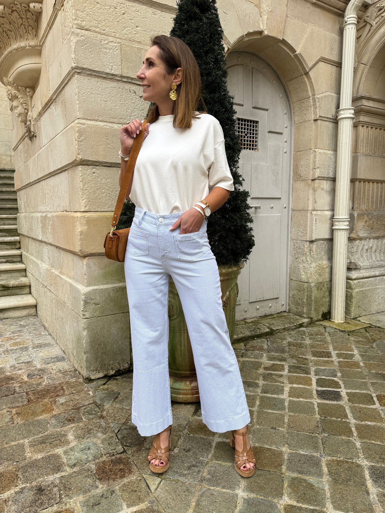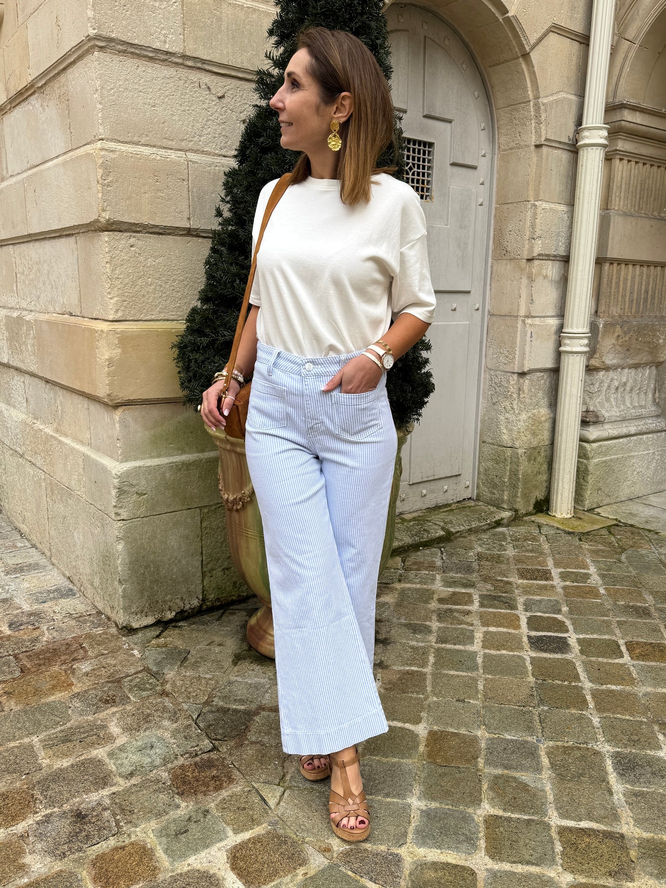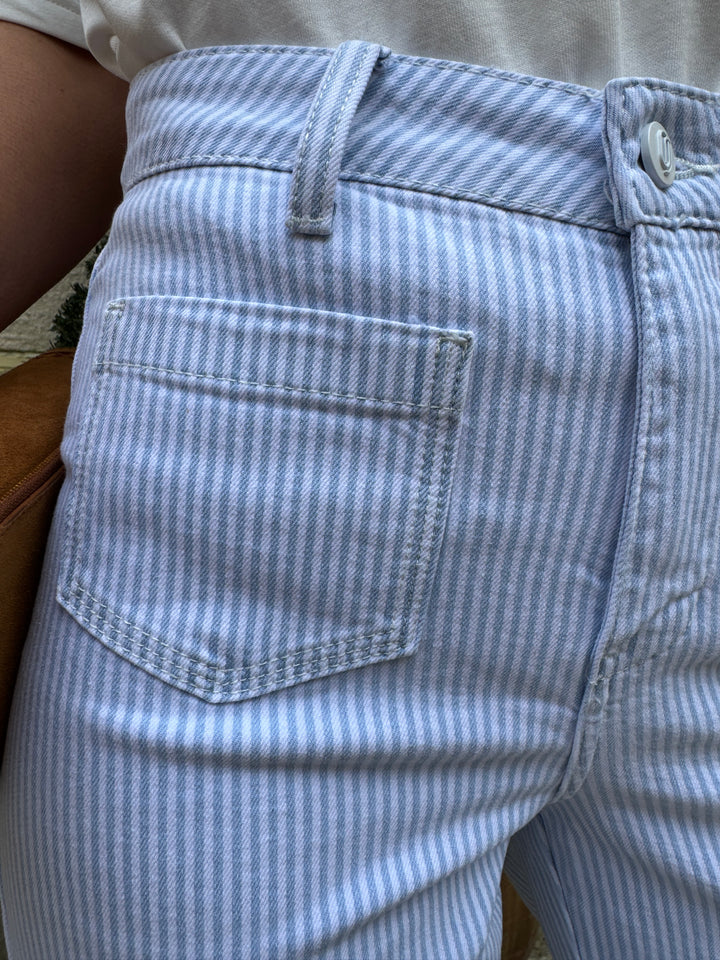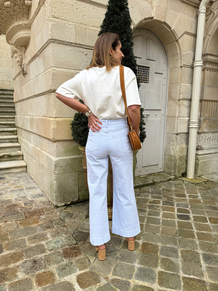 Notre jeans GASPARETTE de la marque Oraije avec son denim à rayures bleu ciel et blanches est doté d'une coupe wide, il s'évase subtilement de la fesse jusqu'en bas de la cuisse, offrant un tombé fluide et flatteur. Ce modèle à taille haute sublime la silhouette et apporte une touche moderne à vos tenues. Pratique et stylé, il est conçu avec deux poches plaquées à l’avant et une fermeture à boutons et zip pour un ajustement parfait. Enrichi en coton (98,5%) et en élasthanne (1,5%) pour plus de confort et d’élasticité, ce jeans est un essentiel pour affirmer votre style unique.