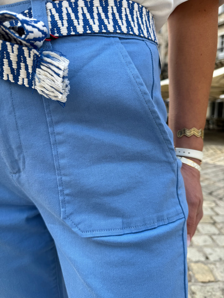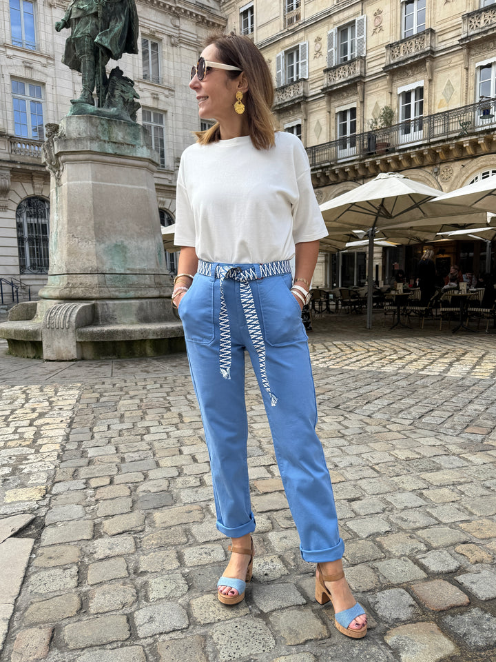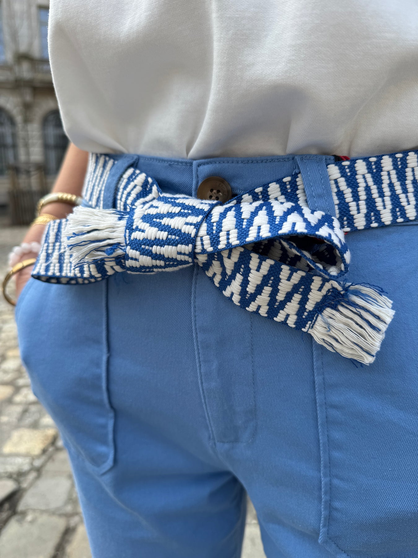 Ce pantalon droit bleu avec sa ceinture tressée blanc et bleu MARISOL signée La Petite Etoile est à retrouver dans vos boutiques De La Mode la Rochelle.