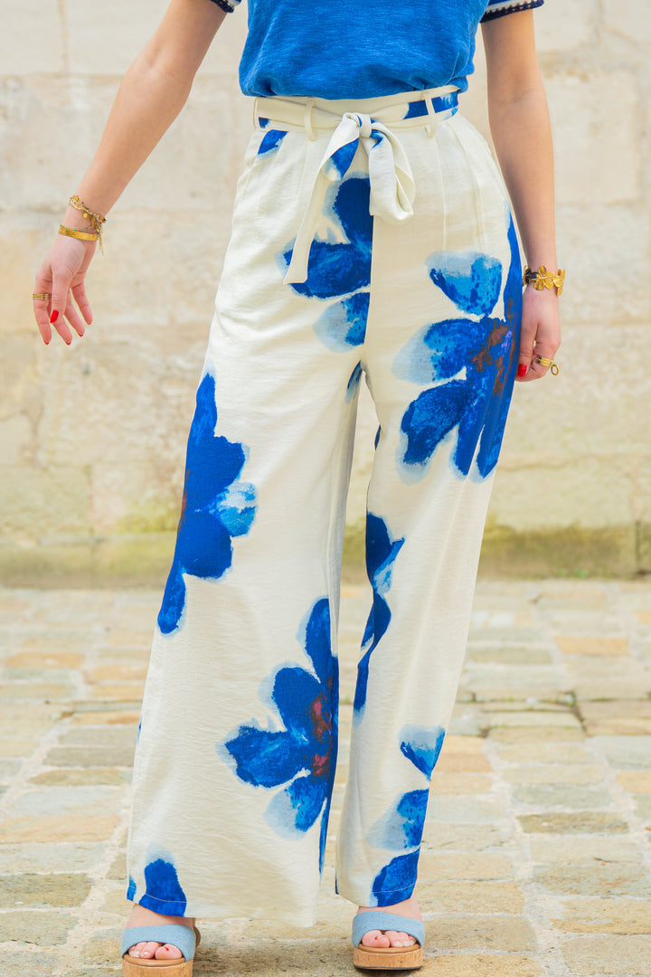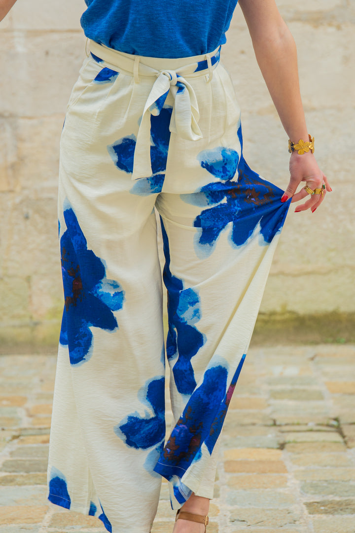 Pantalon fluide écru imprimé floral bleu roi JUANA