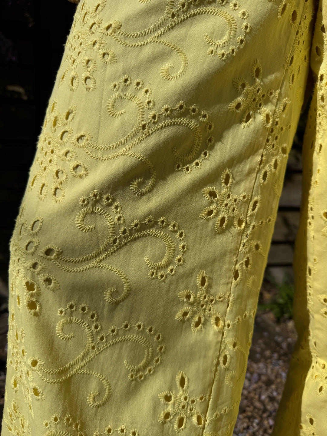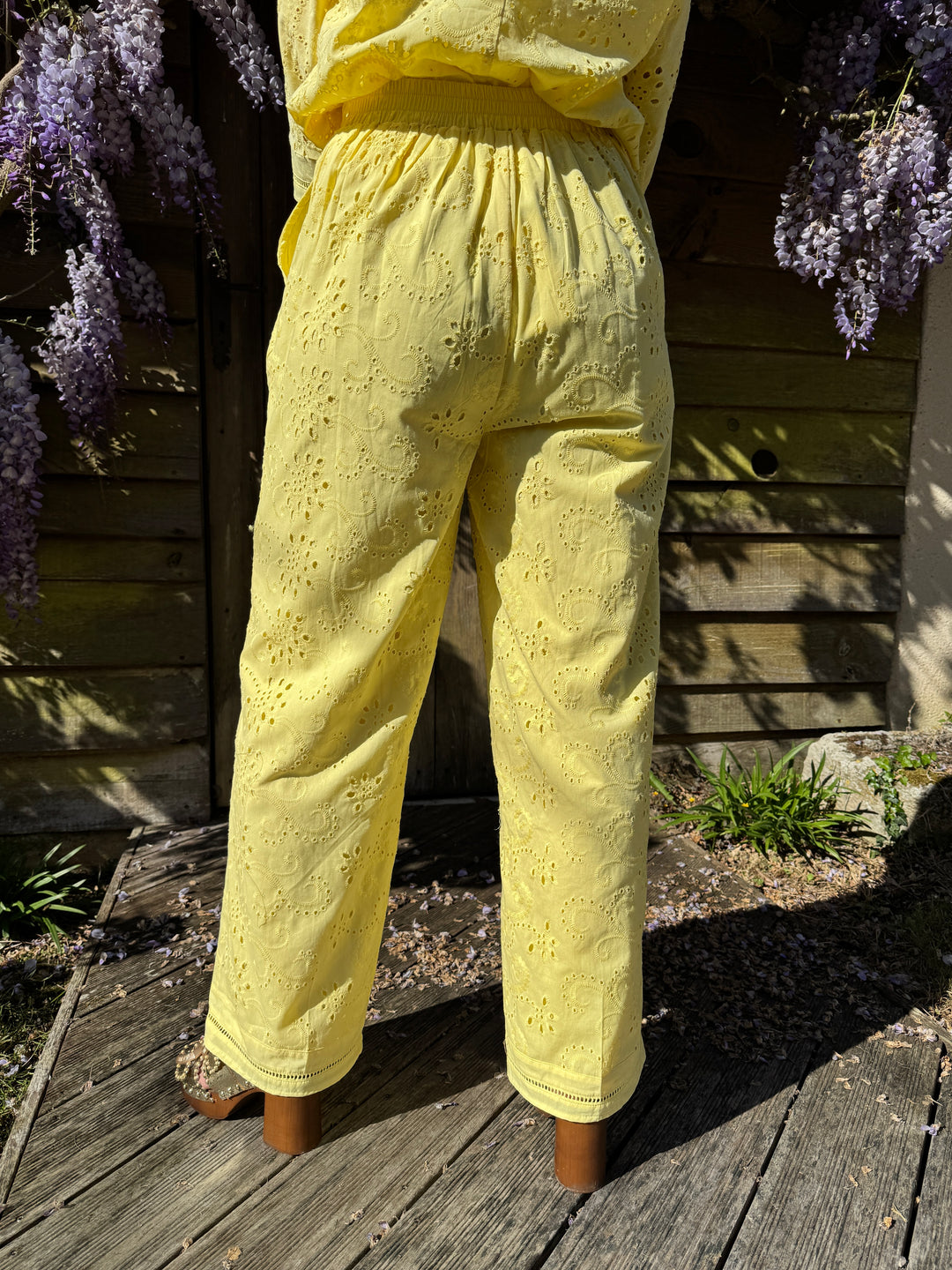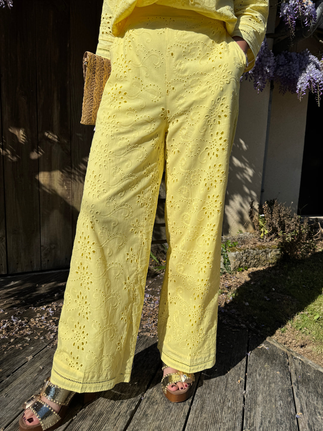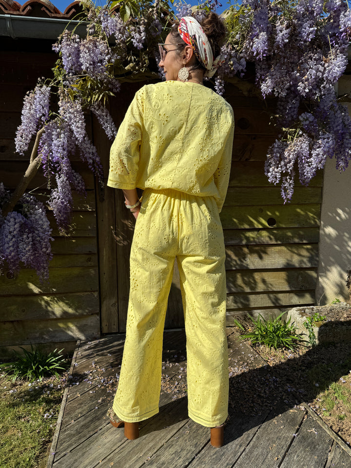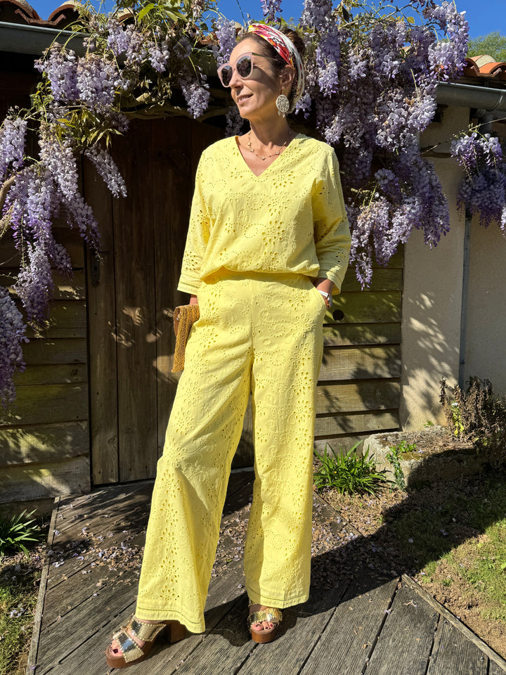 Retrouvez ce pantalon jaune droit en broderie anglaise dans votre boutique De La Mode la Rochelle.