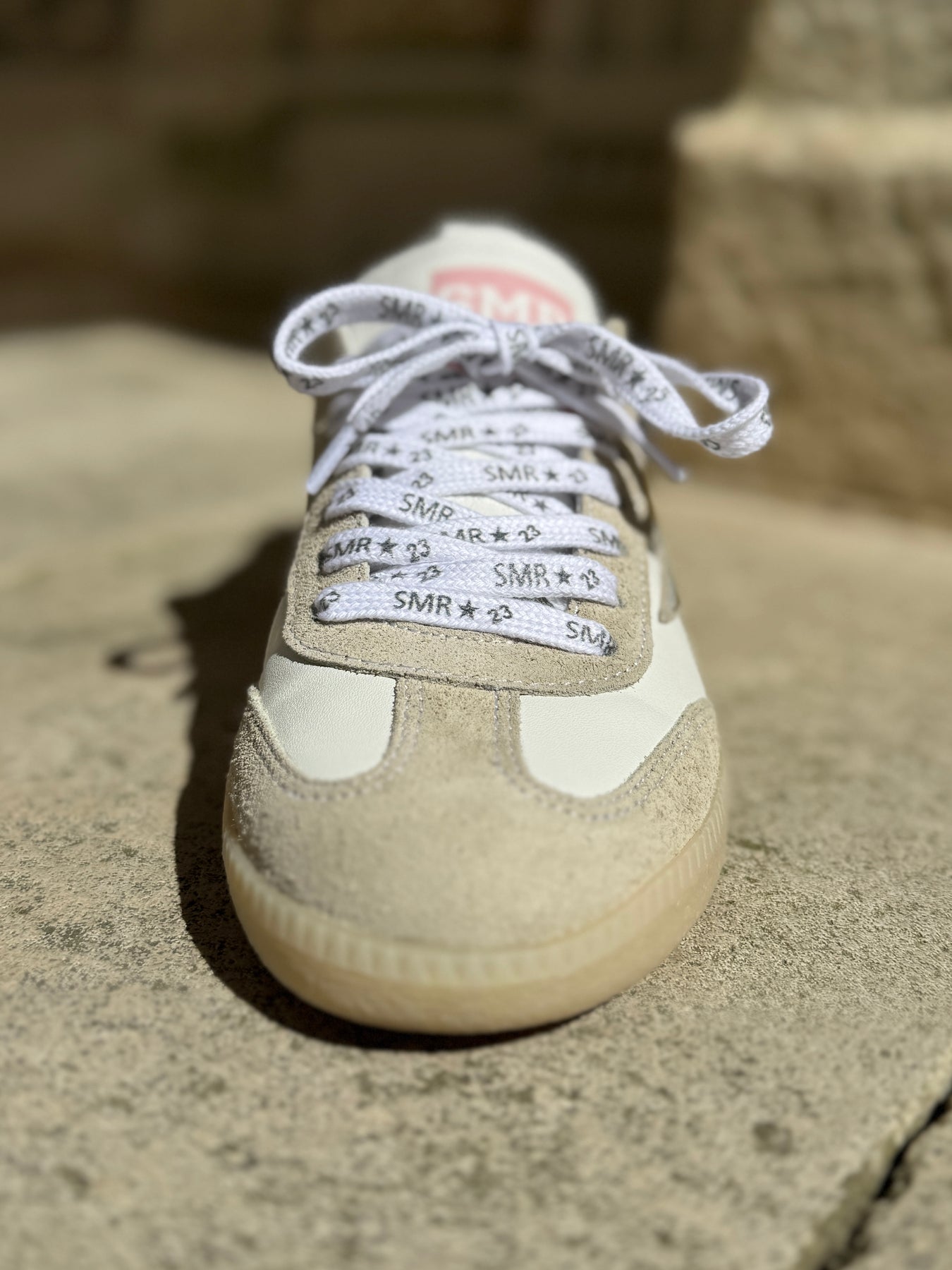 Les lacets arborent l’inscription "SMR23" pour un look signature unique, tandis que la languette affiche un logo SMR rose et blanc en haut, ajoutant une touche de contraste féminine. Ce modèle est monté sur une semelle extérieure en caoutchouc qui assure confort et durabilité au quotidien.