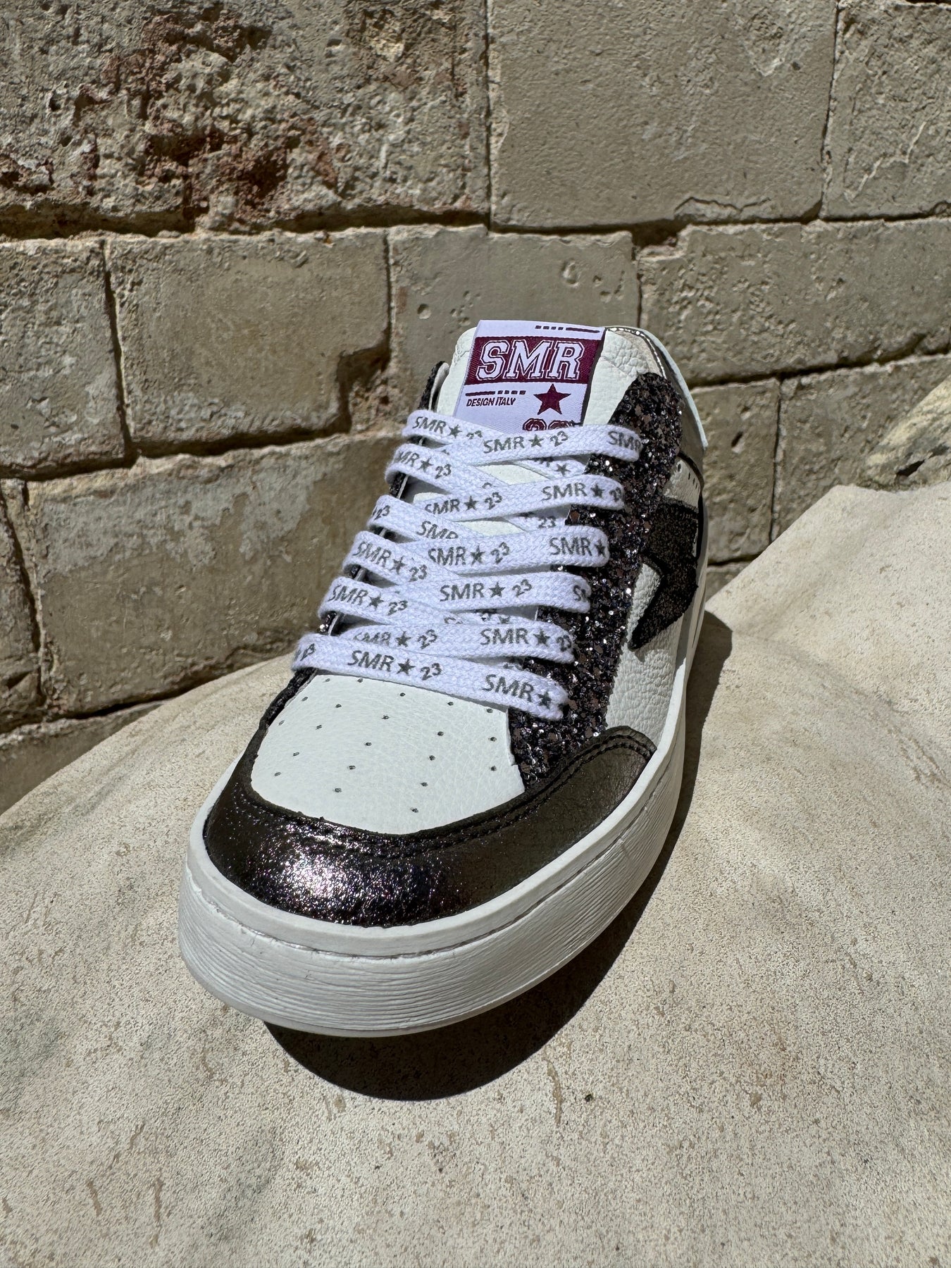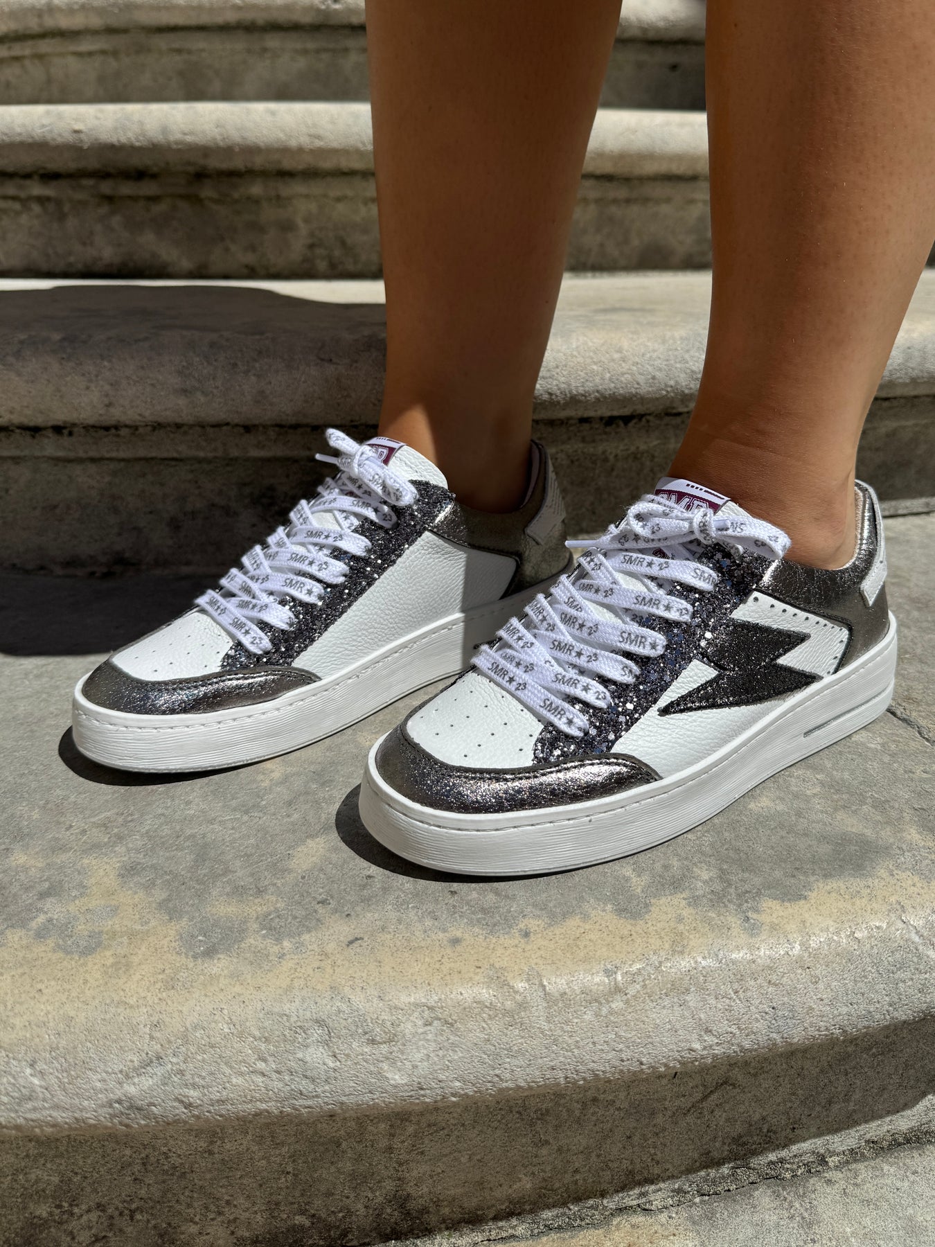 Le contrefort blanc en cuir lisse avec le logo SMR23 argenté renforce le caractère chic et unique de ces baskets, tandis que les accents de cuir lisse noir acier sur le devant et à l'arrière ajoutent une dimension contrastée à cette paire de baskets tendance.