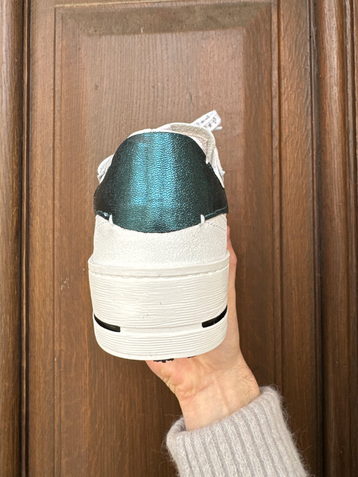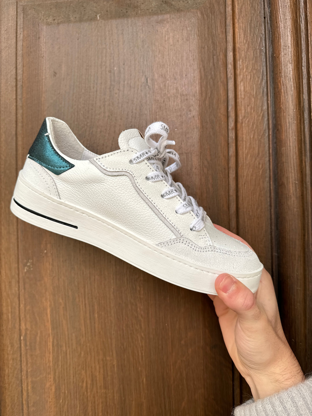 Craquez pour les baskets ALE A610 de SEMERDJIAN, un modèle intemporel et élégant. Ces baskets basses SMR se distinguent par leur tige en cuir grainé et cuir craquelé blanc, offrant une texture unique et sophistiquée. L'étoile dorée sur le côté ajoute une touche d'éclat, tandis que le contrefort vert sapin apporte une subtile note de couleur. Les lacets blancs ornés du logo SMR23 noir ajoutent une signature distinctive, et la semelle blanche complète le look avec simplicité. Avec leur semelle intérieure en cuir et leur semelle extérieure en caoutchouc, elles garantissent un confort durable.