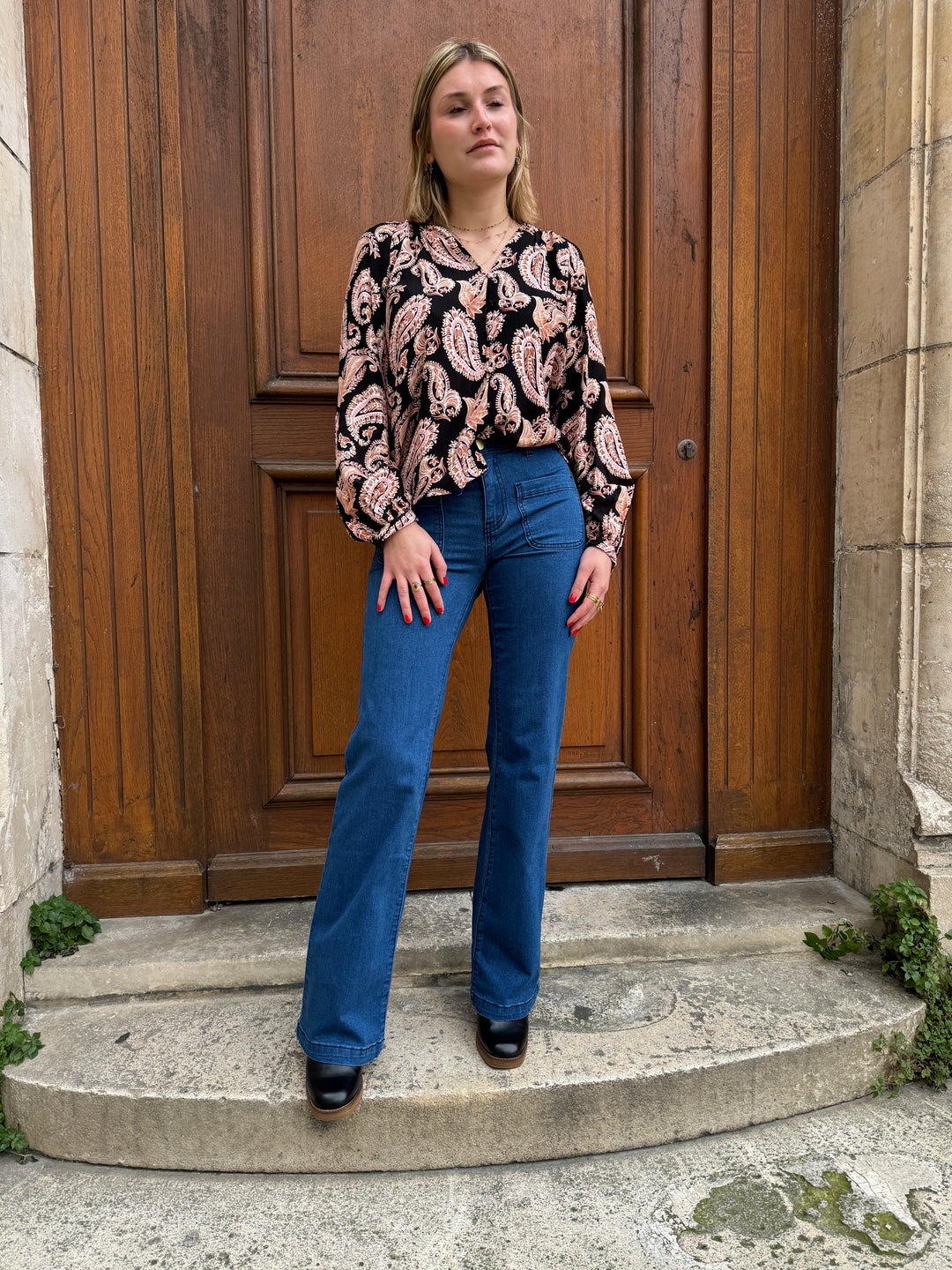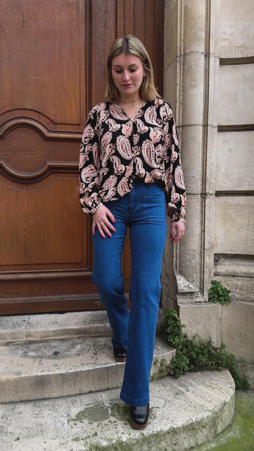Cette blouse se marie parfaitement avec notre jeans SONNY stone à la ceinture tressée.