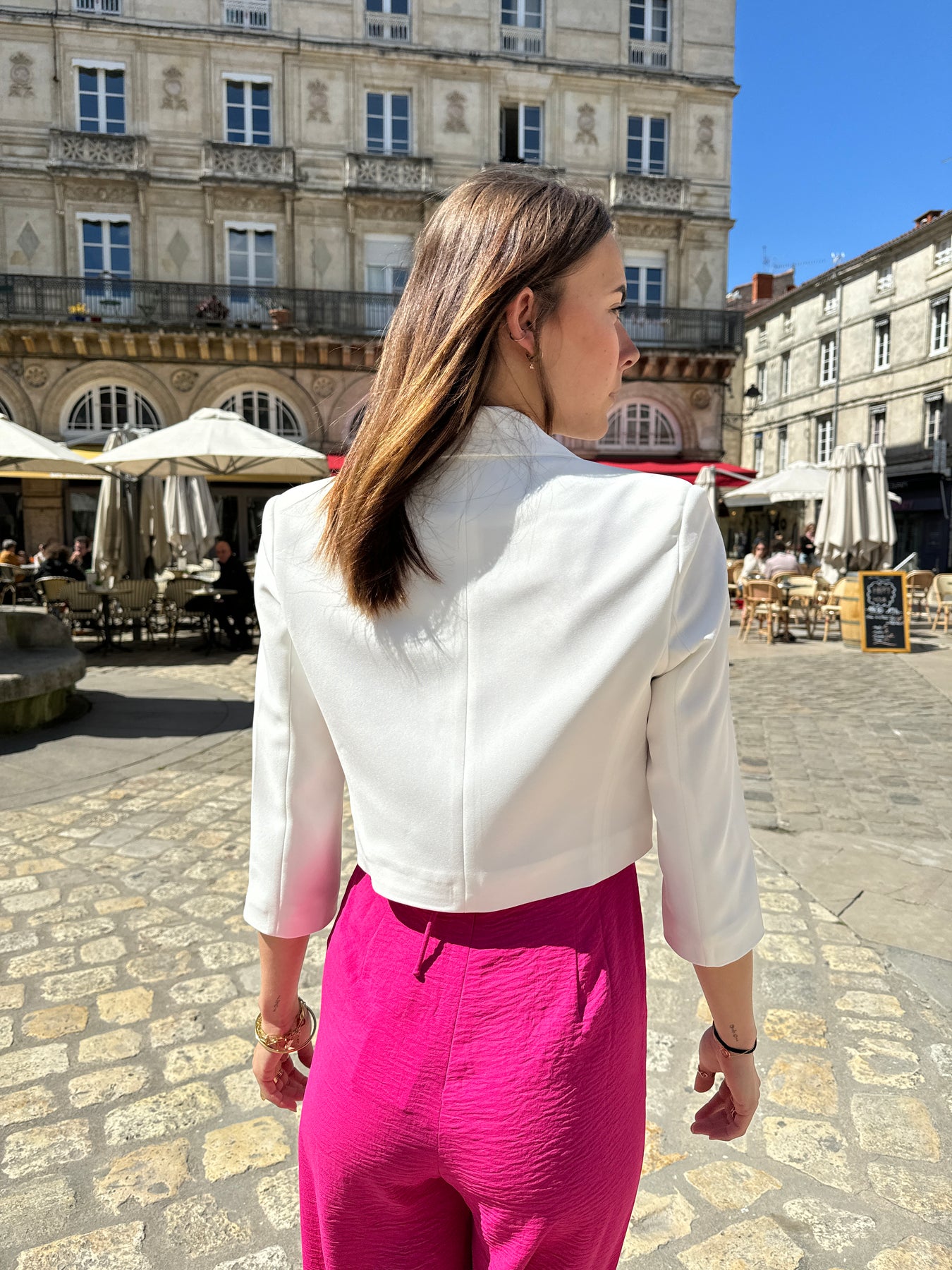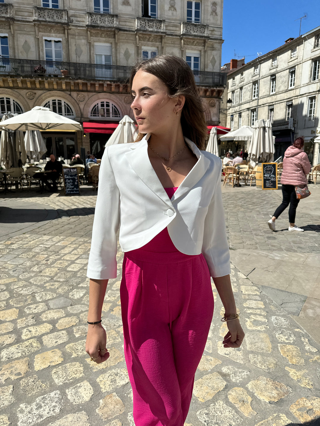 Sa teinte blanche douce et lumineuse apporte une touche de fraîcheur à votre look, tandis que sa coupe flatteuse complète à merveille la silhouette. Parfait pour être porté sur notre robe ARIANE blanche, ce boléro ajoute une dimension supplémentaire à votre tenue, vous permettant de briller de mille feux lors de votre prochain événement.