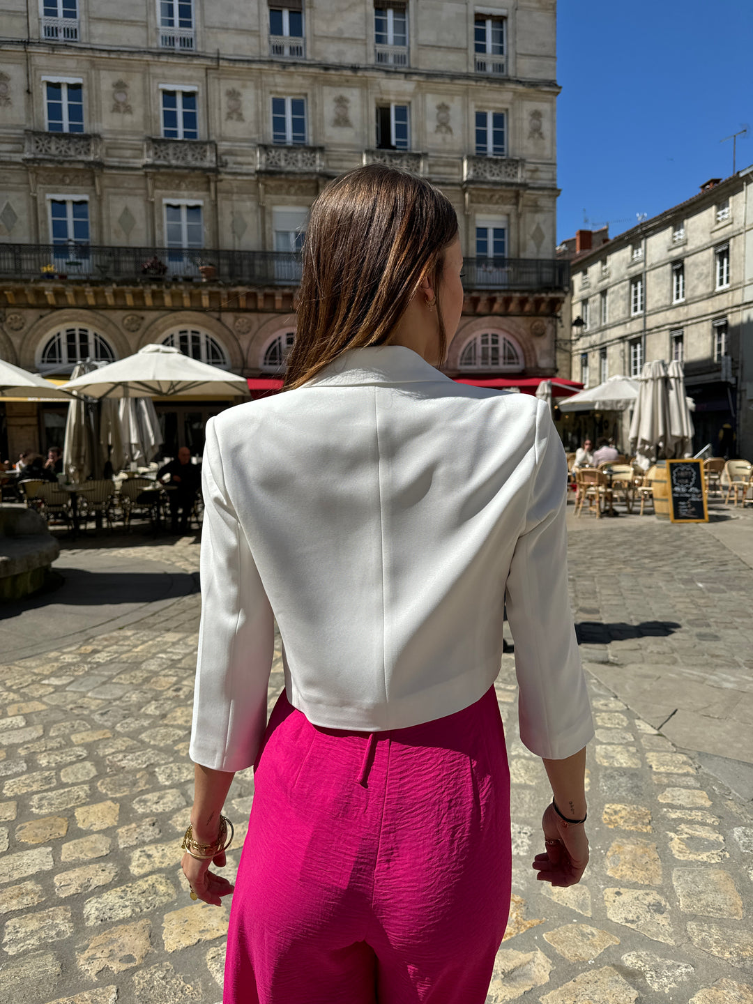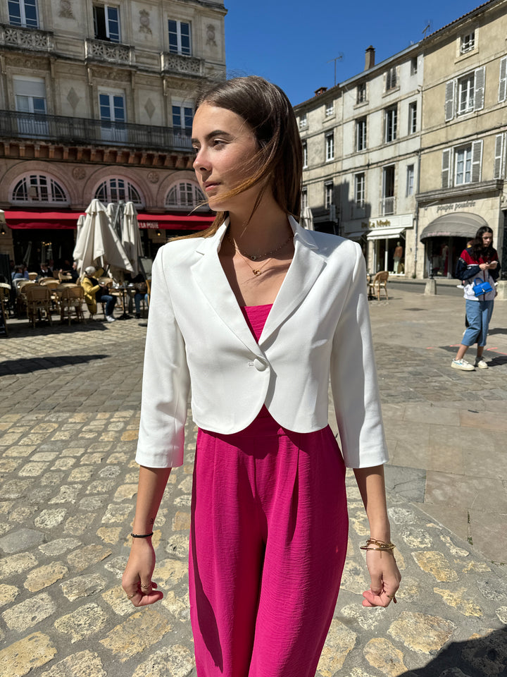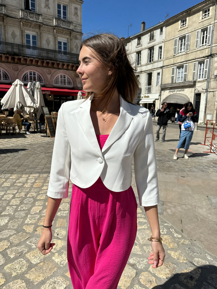 Ajoutez une touche de grâce et d'élégance à votre tenue avec notre boléro court blanc, l'accessoire parfait pour sublimer votre robe blanche lors d'un événement spécial. Ce boléro court est un indispensable de toute garde-robe, offrant une silhouette chic et sophistiquée en un instant.