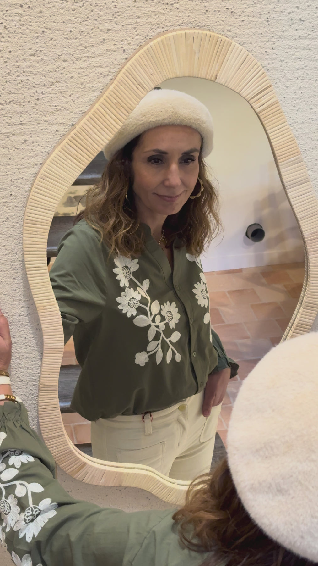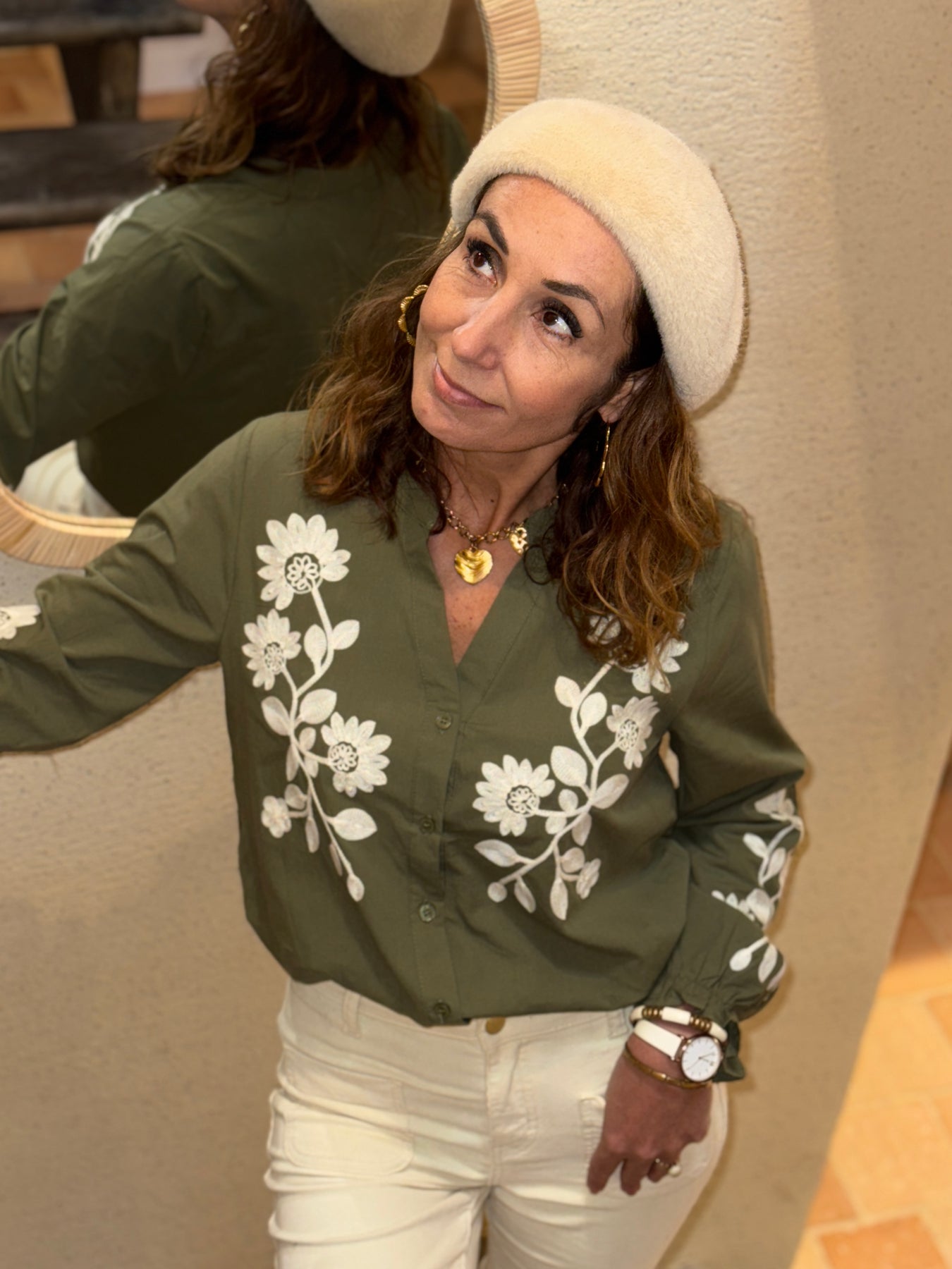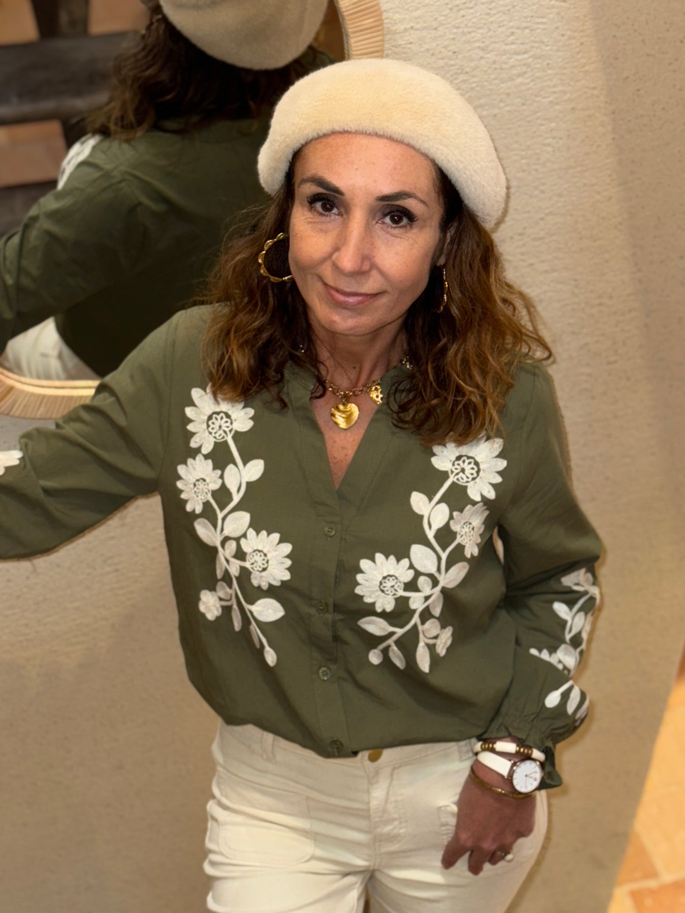 Retrouvez cette chemise kaki aux broderies florales écrues ELISABETH dans votre boutique De La Mode la Rochelle.