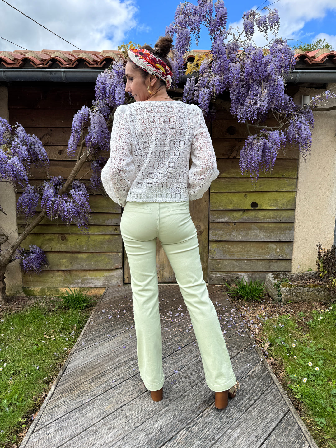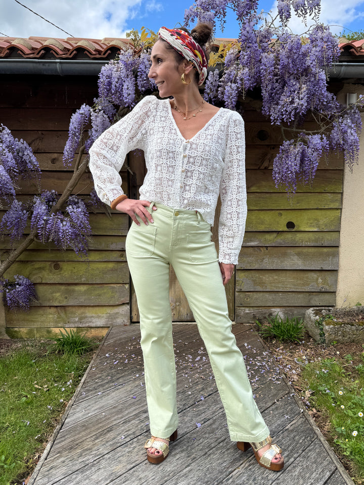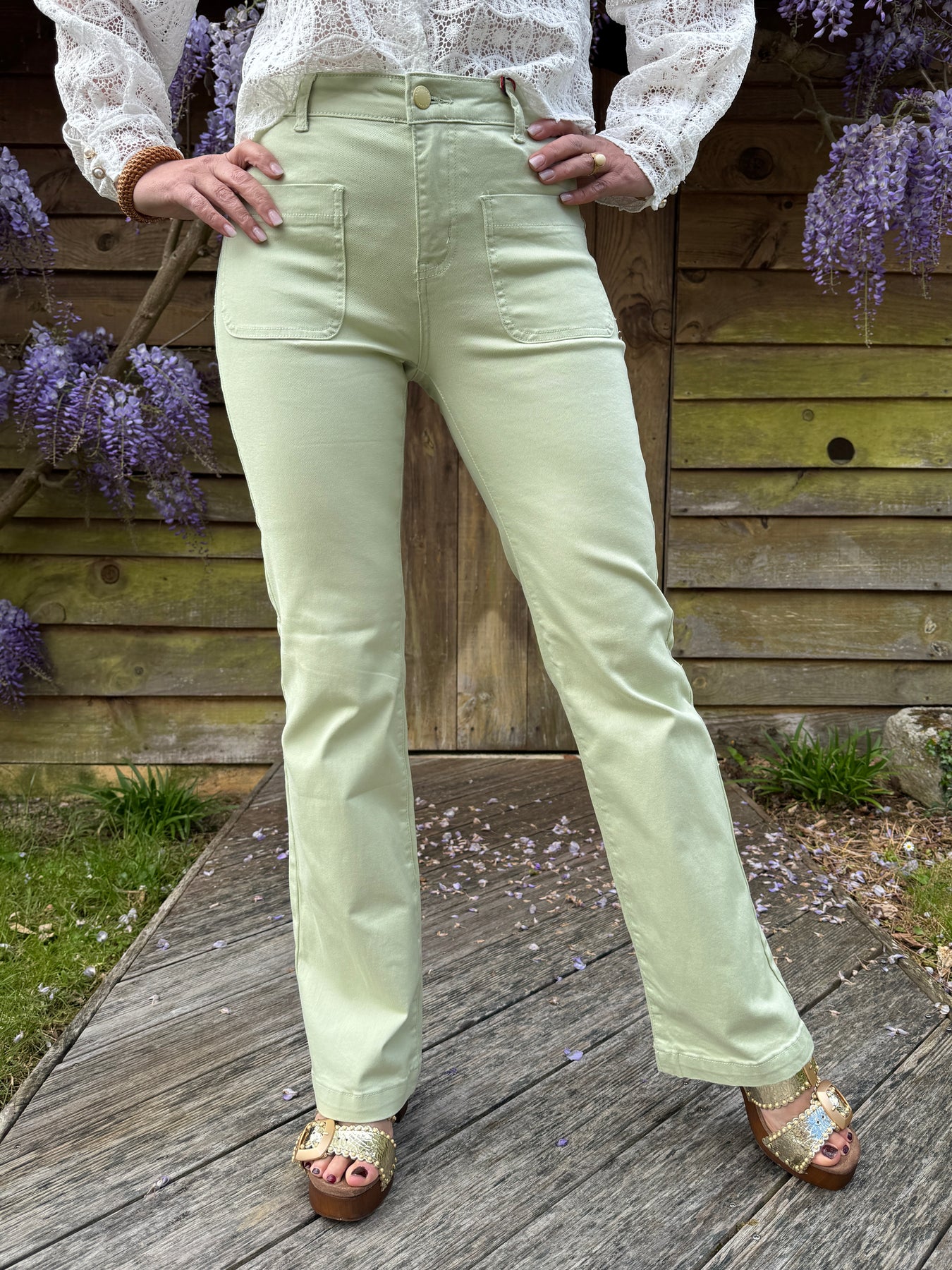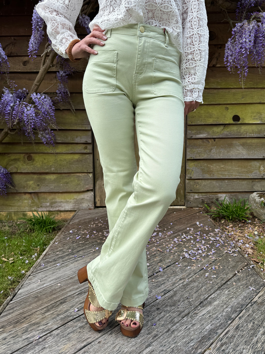 Ce jeans SONNY vert amande avec sa forme flare signée La Petite Étoile est à retrouver dans vos boutiques De La Mode La Rochelle, la Châtaigneraie et Fontenay-le-Comte.