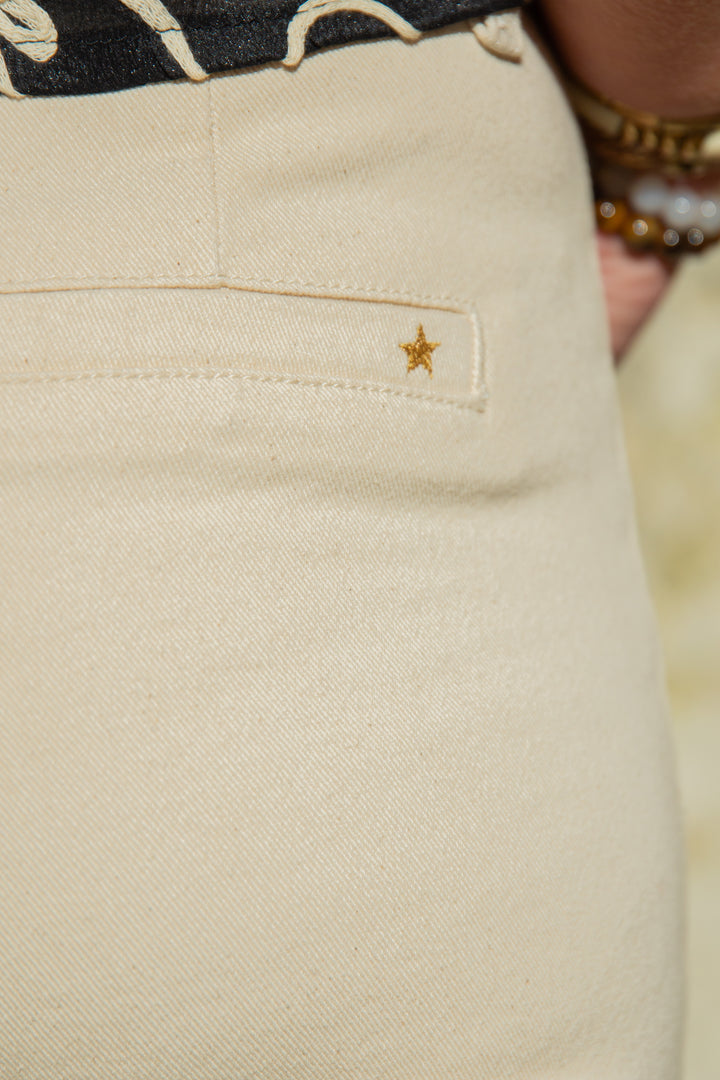 Adoptez le style rétro chic avec le pantalon SONNY naturel de La Petite Étoile. Ce modèle, confectionné en 98% coton, 2% élasthanne, allie confort et élégance grâce à sa coupe flare évasée en bas des jambes. Les deux poches plaquées sur le devant ajoutent une touche pratique, tandis que les fausses poches passepoilées à l'arrière apportent une note sophistiquée. La fermeture se fait par un bouton et un zip discret. L'étoile emblématique sur la poche arrière droite et le jacron "La Petite Étoile" à l'arrière signent ce pantalon avec une touche d'authenticité.