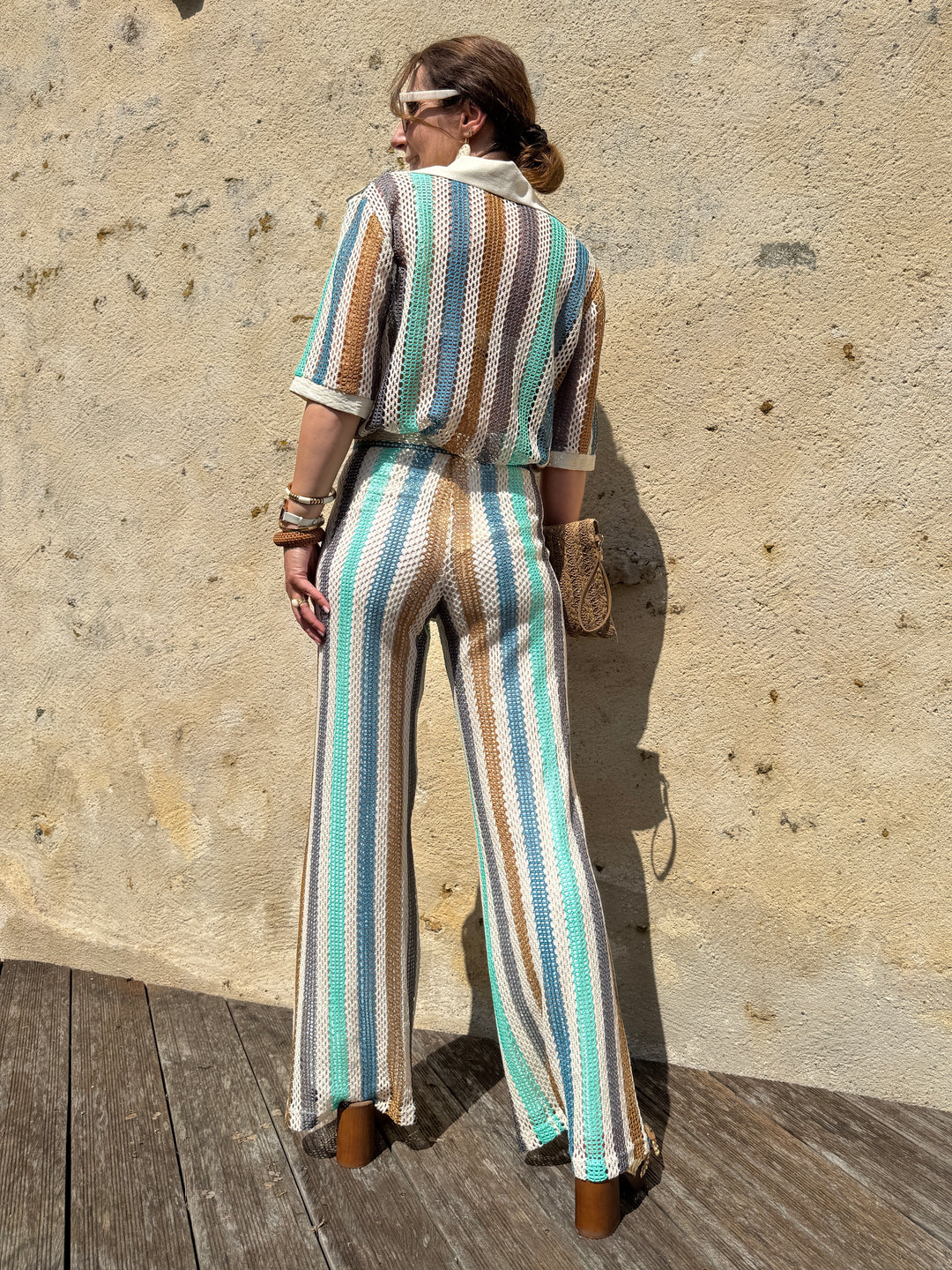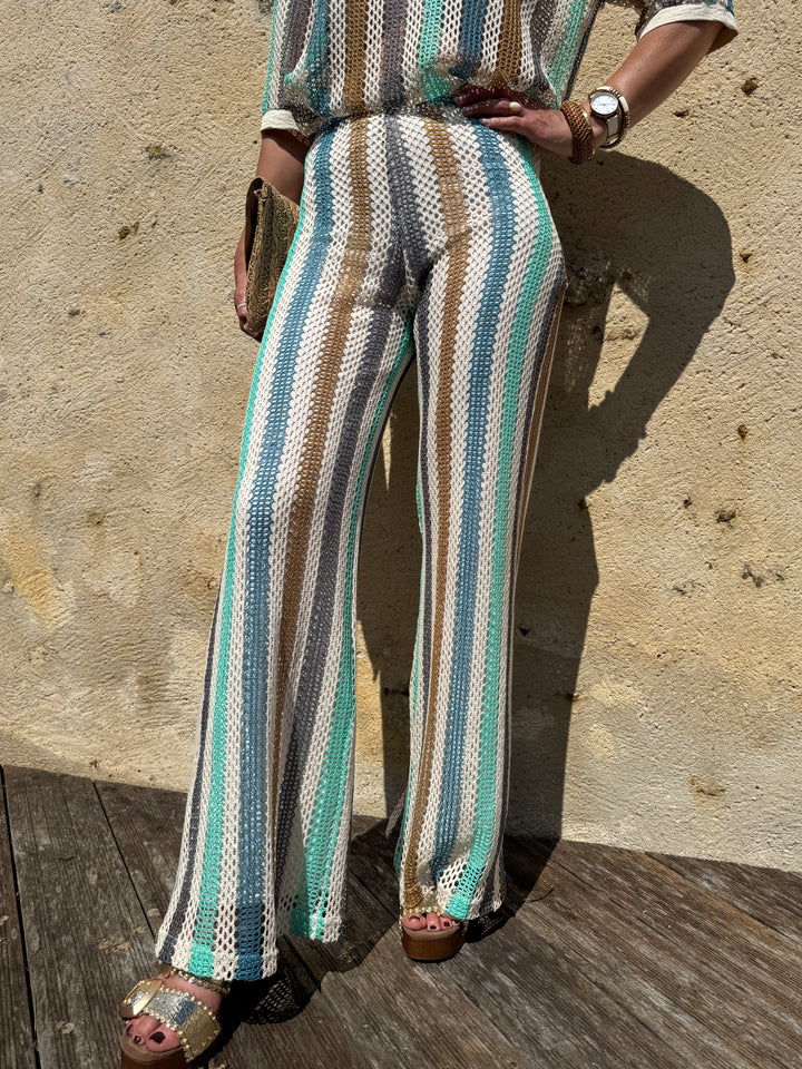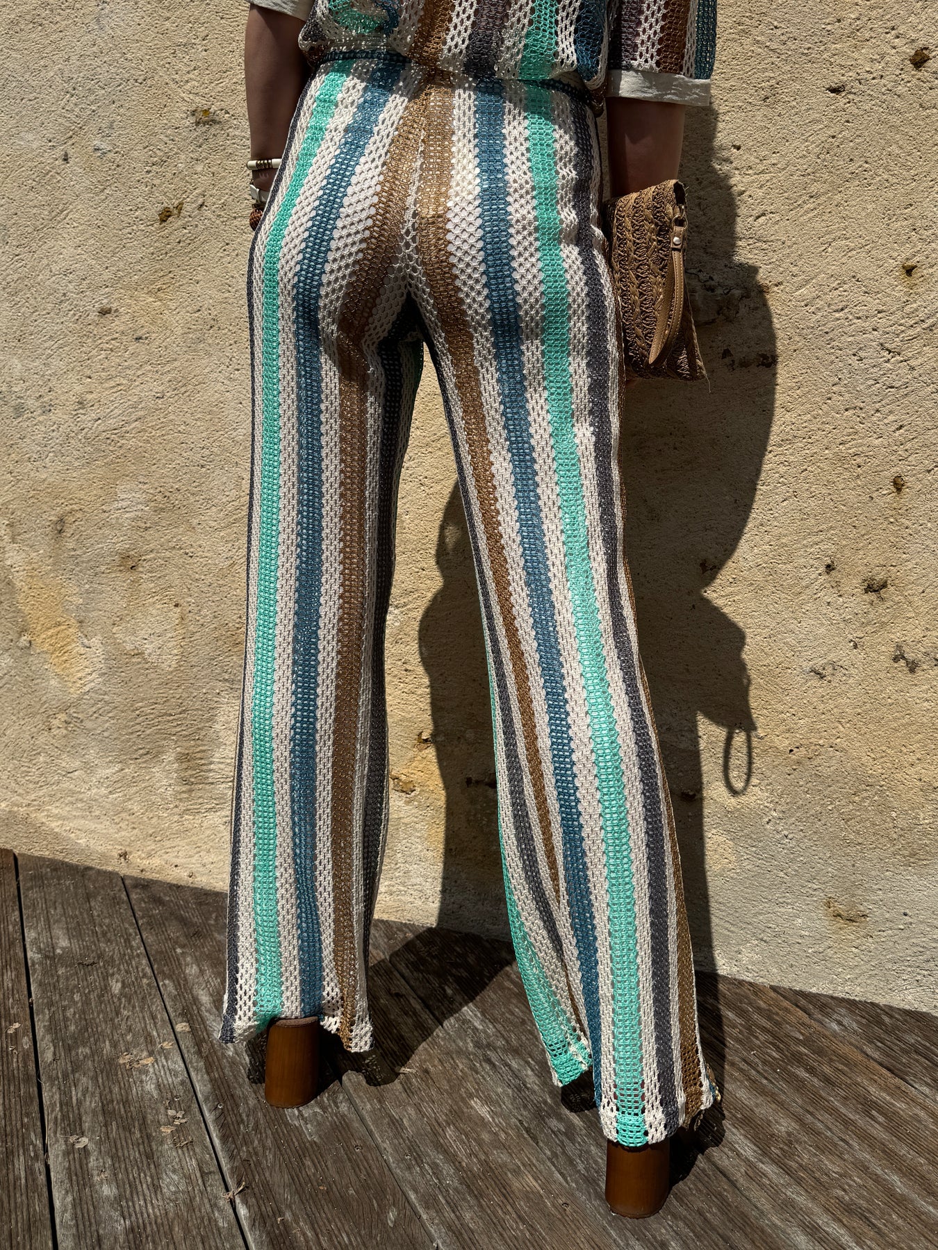 Notre pantalon MADRID en crochet est une pièce unique qui combine confort et style. Ce pantalon en turquoise ecru est confectionné dans un tricot façon filet, apportant une texture légère et aérienne à votre look. Les bandes verticales de différentes couleurs, incluant le bleu, le turquoise, l’écru et le camel, ajoutent un effet dynamique et moderne qui met en valeur la silhouette.