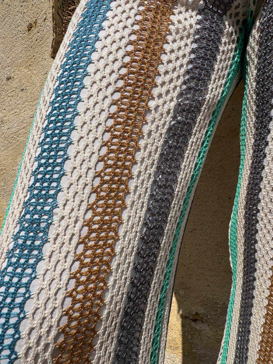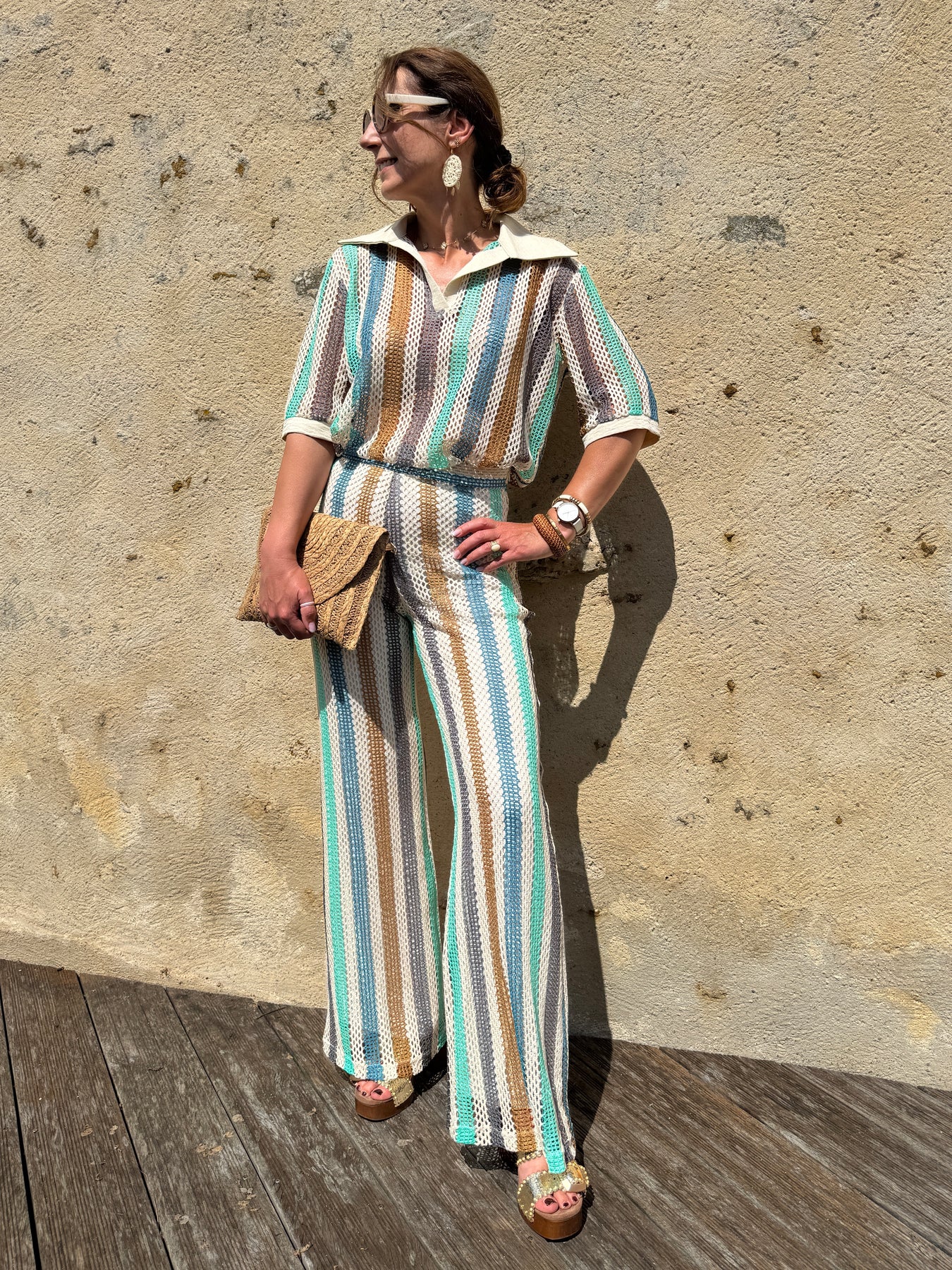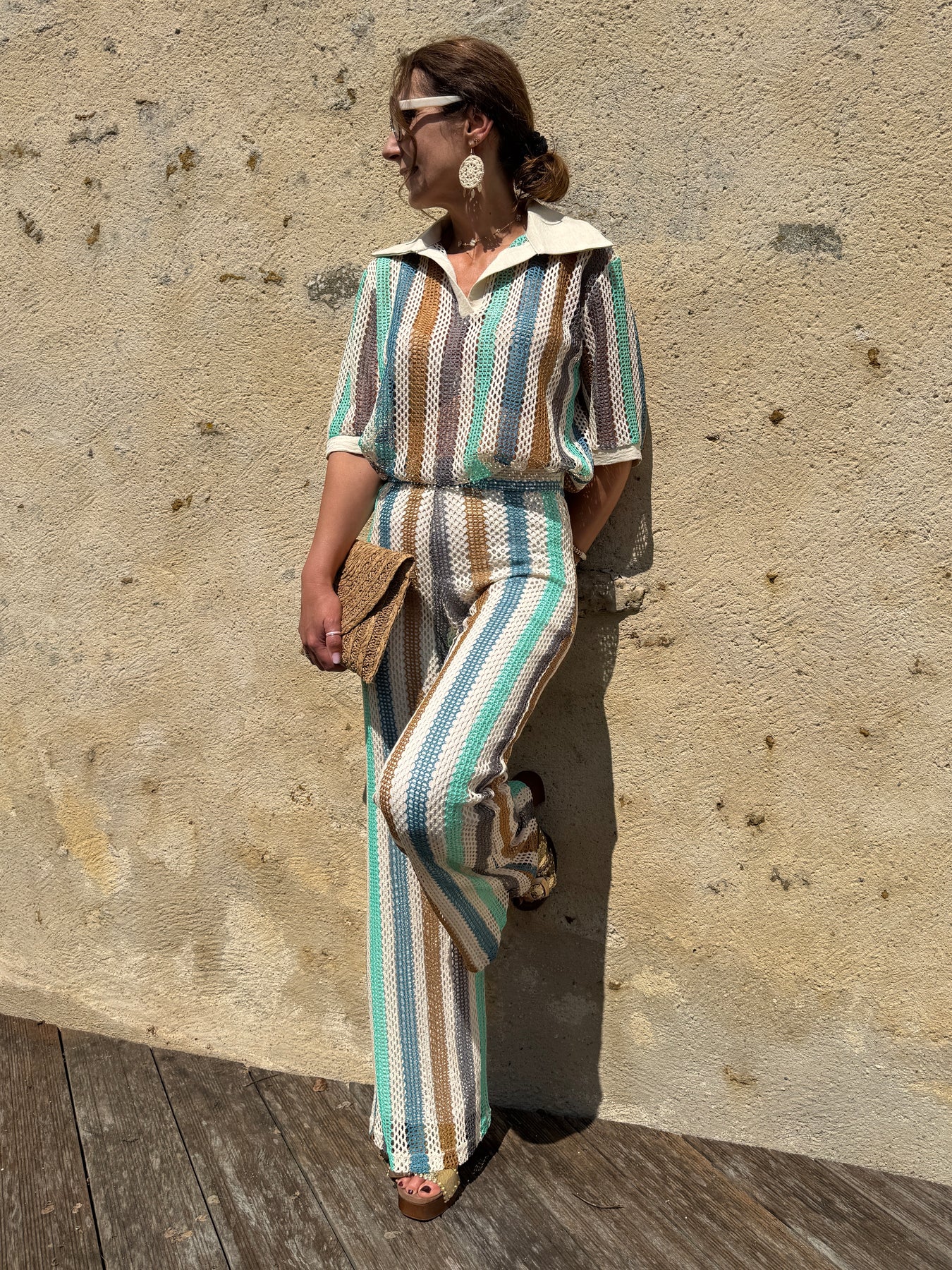 Notre pantalon MADRID en crochet est une pièce unique qui combine confort et style. Ce pantalon en turquoise ecru est confectionné dans un tricot façon filet, apportant une texture légère et aérienne à votre look. Les bandes verticales de différentes couleurs, incluant le bleu, le turquoise, l’écru et le camel, ajoutent un effet dynamique et moderne qui met en valeur la silhouette.