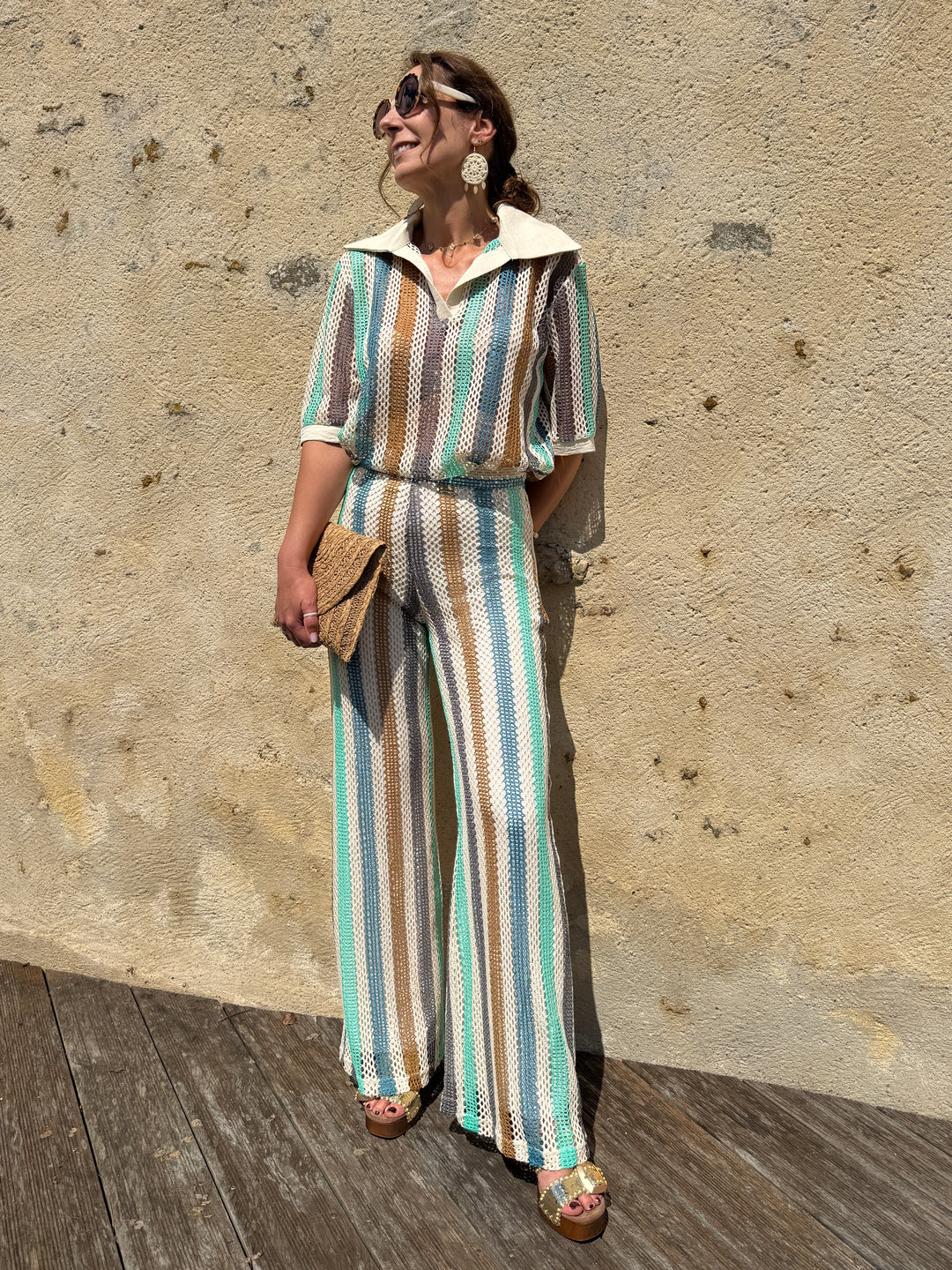 Retrouvez ce pantalon en crochet turquoise et écru MADRID dans vos boutiques De La Mode la Châtaigneraie, Fontenay-le-Comte et La Rochelle.