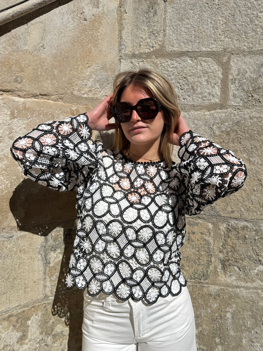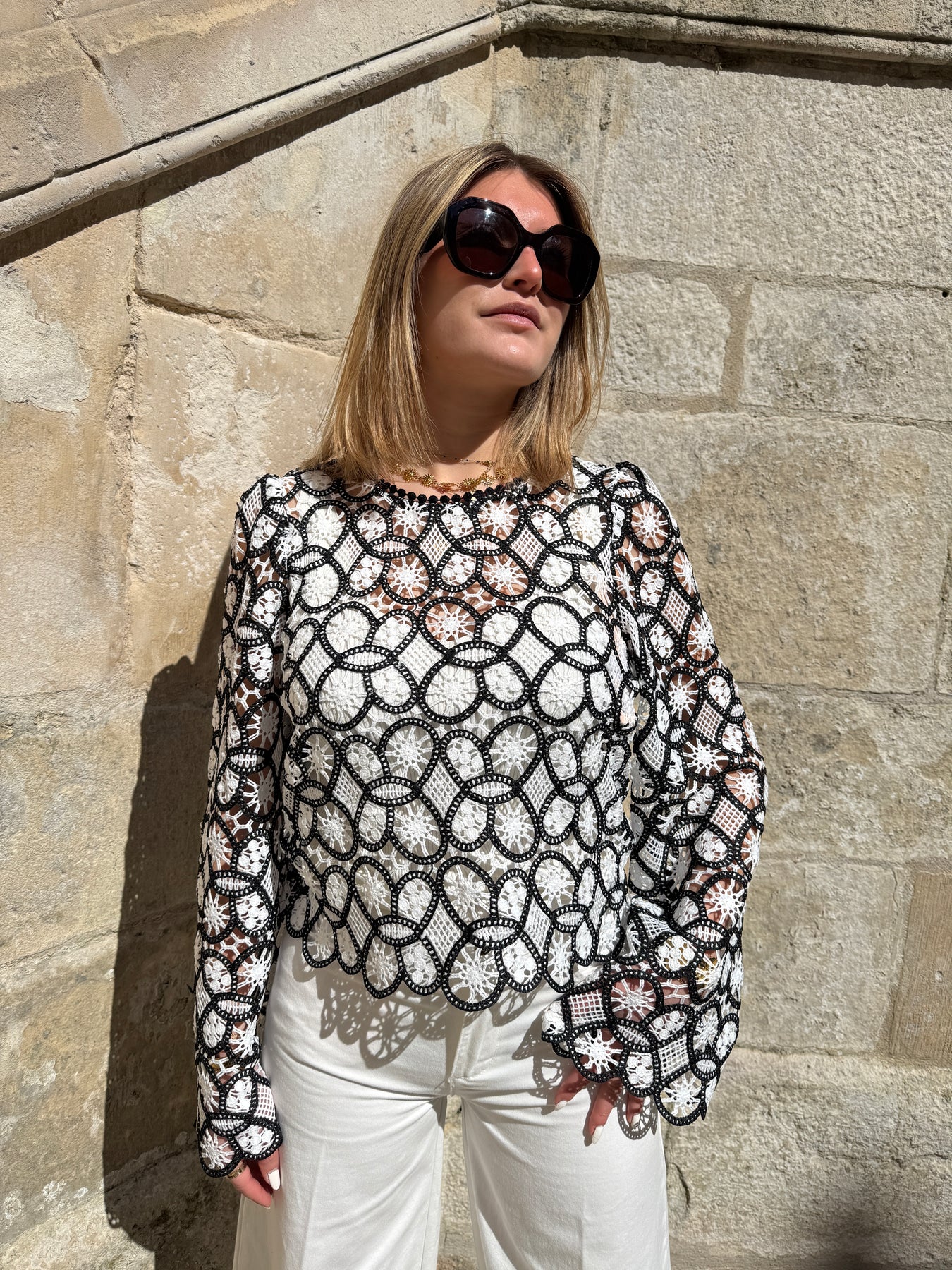 Ce top ajouré blanc et noir est à retrouver dans votre boutique De La Mode la Rochelle.
