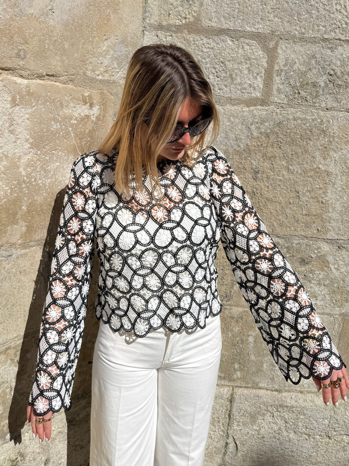 Le top AELA est une pièce élégante et raffinée, parfaite pour apporter une touche de sophistication à votre tenue. Confectionné en 100% polyester, il offre une texture fluide et agréable à porter. Son col rond délicat est sublimé par de fines broderies ajourées noires et blanches, apportant un contraste élégant et un charme unique.
