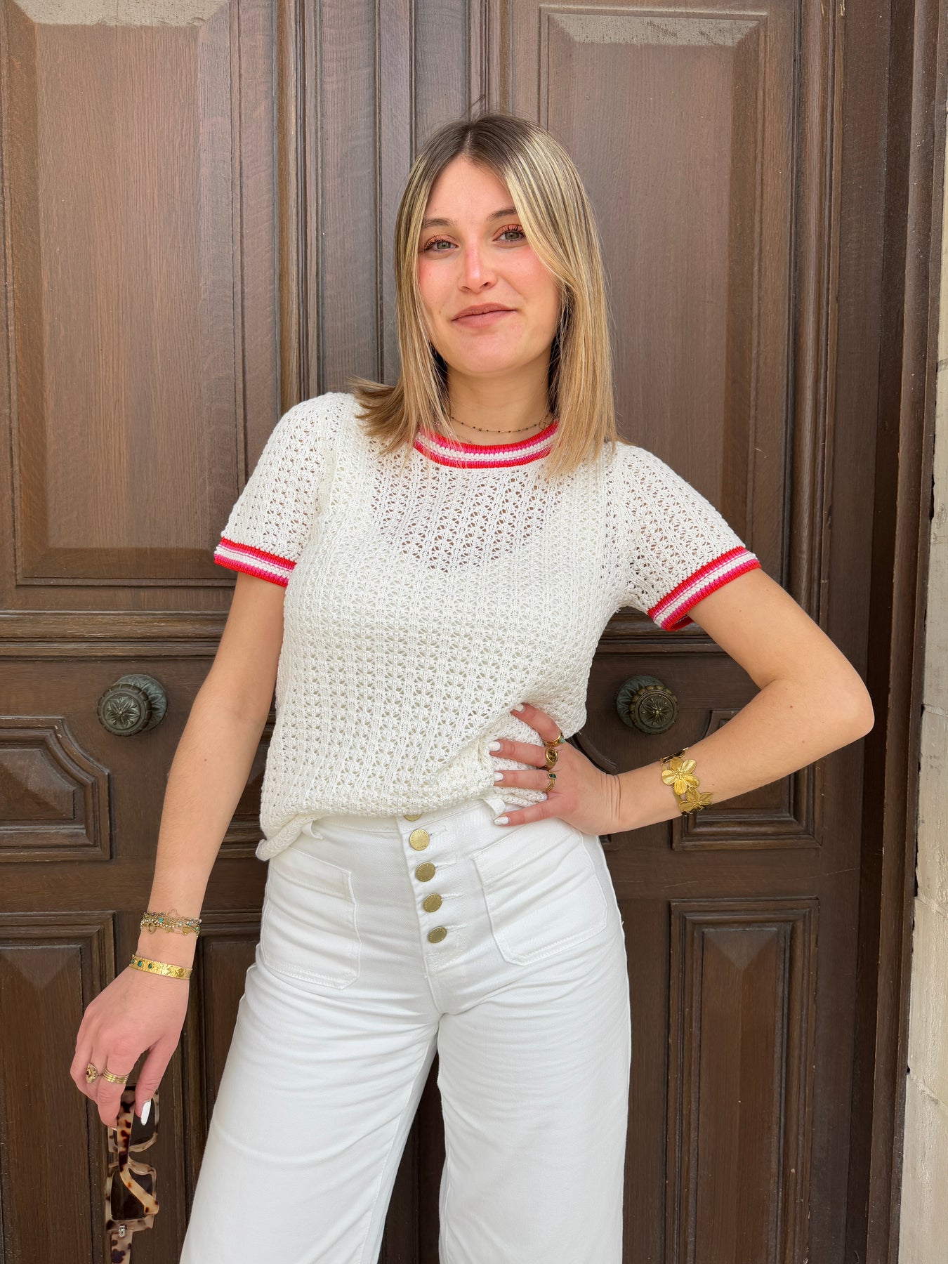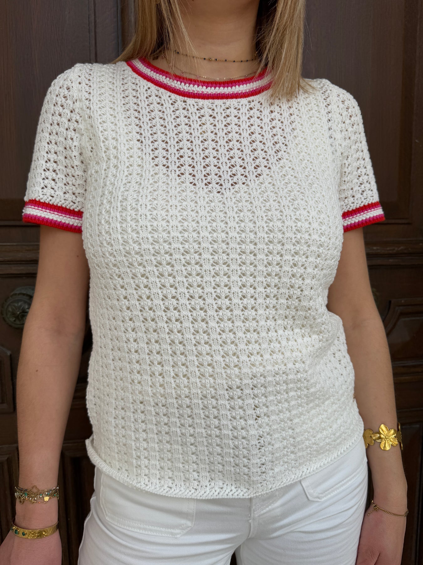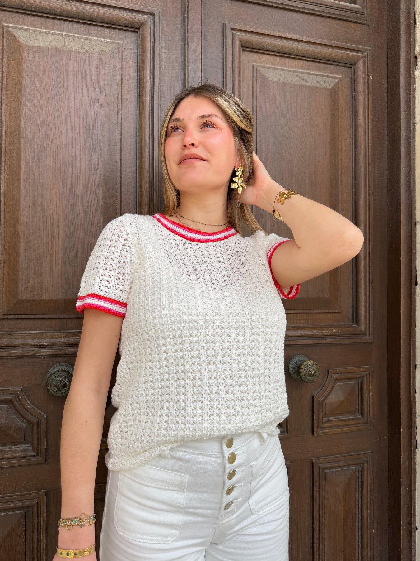 Le top MASON de la marque La Petite Étoile est une pièce estivale pleine de fraîcheur, idéale pour apporter une touche de couleur à votre dressing. Confectionné en maille ajourée 100% coton, il offre une sensation de légèreté et de confort tout au long de la journée. Son coloris écru, rehaussé de détails fuchsia et rouge au niveau du col rond et des manches courtes, lui confère un style moderne et lumineux. Sa coupe droite s’adapte à toutes les morphologies et assure un tombé parfait. Le logo doré "LPE" discrètement apposé sur un médaillon gravé en bas du modèle ajoute une finition élégante et discrète. Ce top ajouré est parfait pour composer un look tendance et casual, aussi bien avec un short en denim qu’un pantalon fluide.